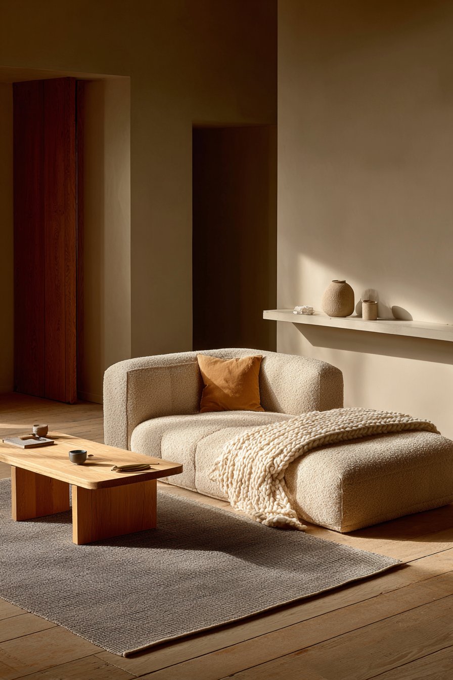A modular sofa in textured sand-colored fabric is arranged in simple L-configuration. The neutral tone works with various color schemes and seasonal changes. One chunky knit blanket in natural wool adds cozy texture. The modular design adapts as living needs evolve over time.