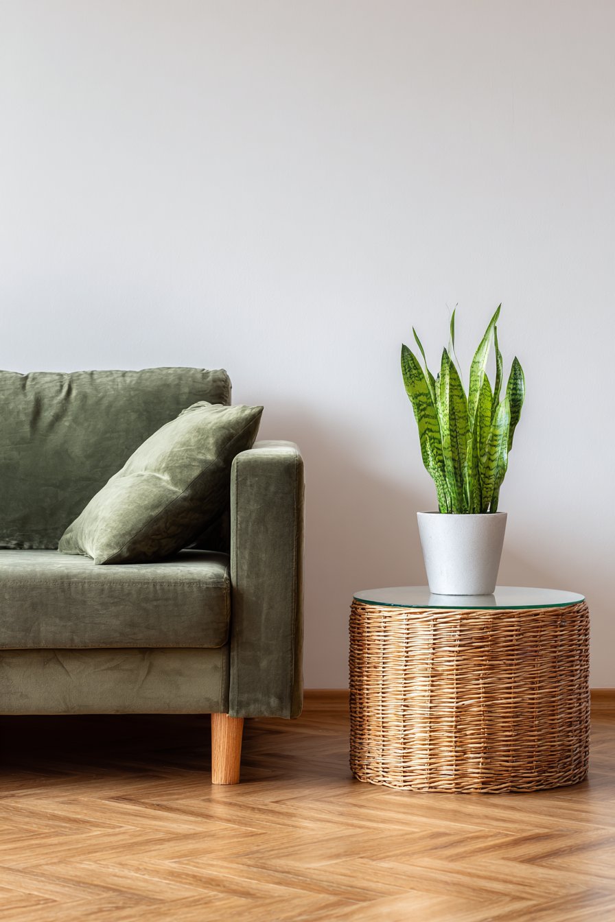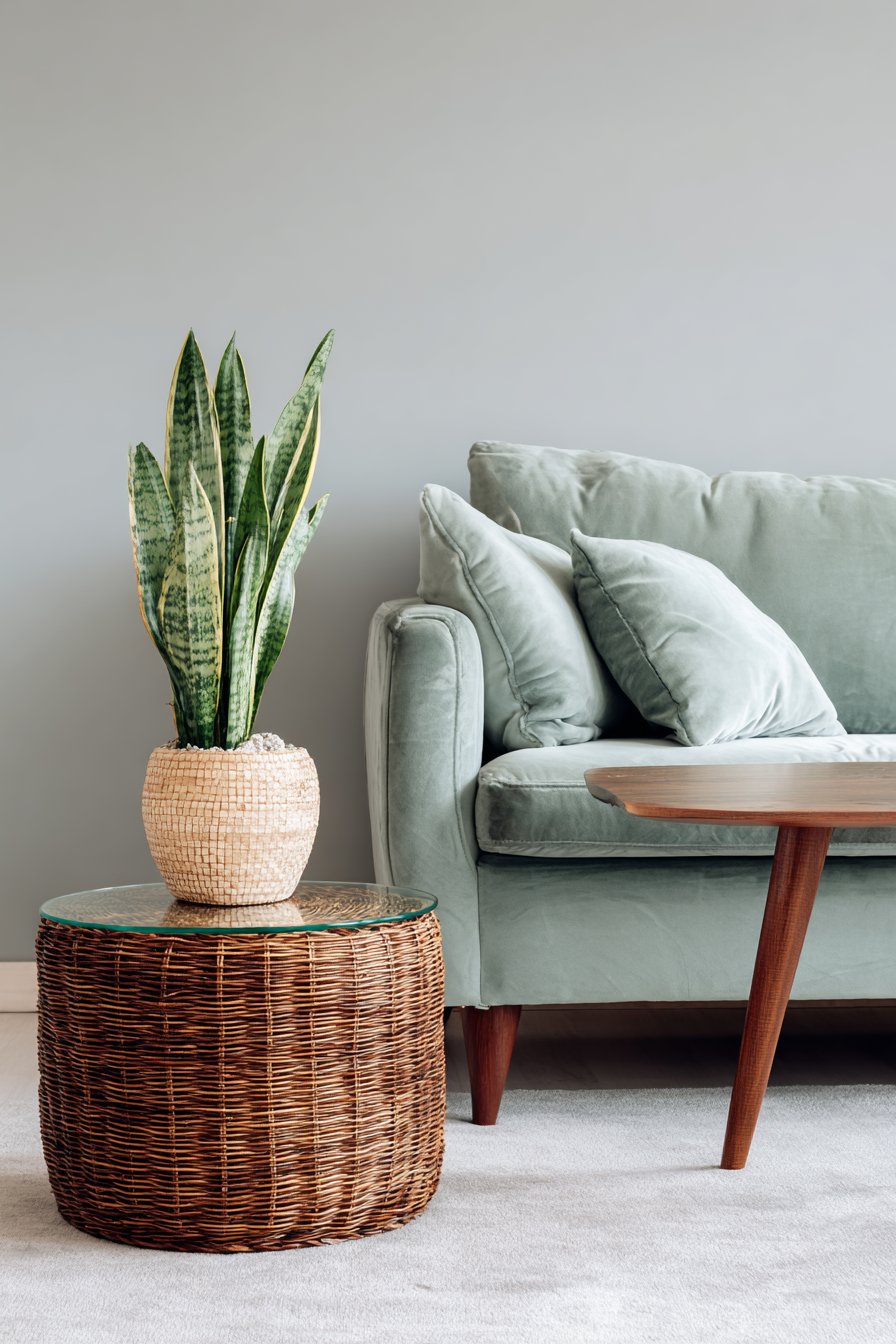 The rattan’s organic texture contrasts elegantly with the smooth velvet upholstery. Light grey carpeting provides soft foundation throughout the room. One large potted snake plant in a ceramic planter adds organic texture and air-purifying benefits. Recessed lighting combined with natural window light creates balanced illumination throughout the day.