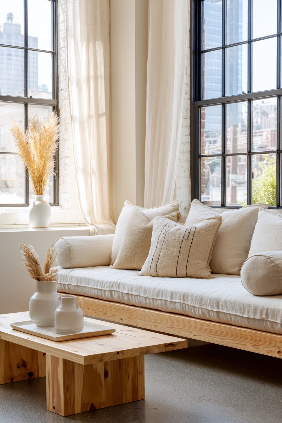 A comfortable daybed-style sofa in natural flax linen features multiple bolster pillows. The pillows in coordinating neutral tones create comfortable support for lounging. A low square coffee table in light ash wood with visible grain anchors the space. Polished concrete flooring provides an industrial-minimalist foundation.