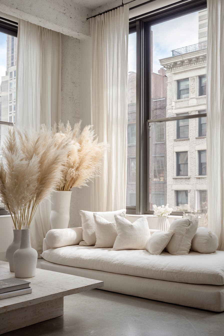 Simple white ceramic vases of varying heights hold minimal dried grasses. The varied heights create visual rhythm without complexity. Large windows with sheer linen panels allow soft diffused natural light throughout the day. The abundant light transforms the space’s character from morning through evening.