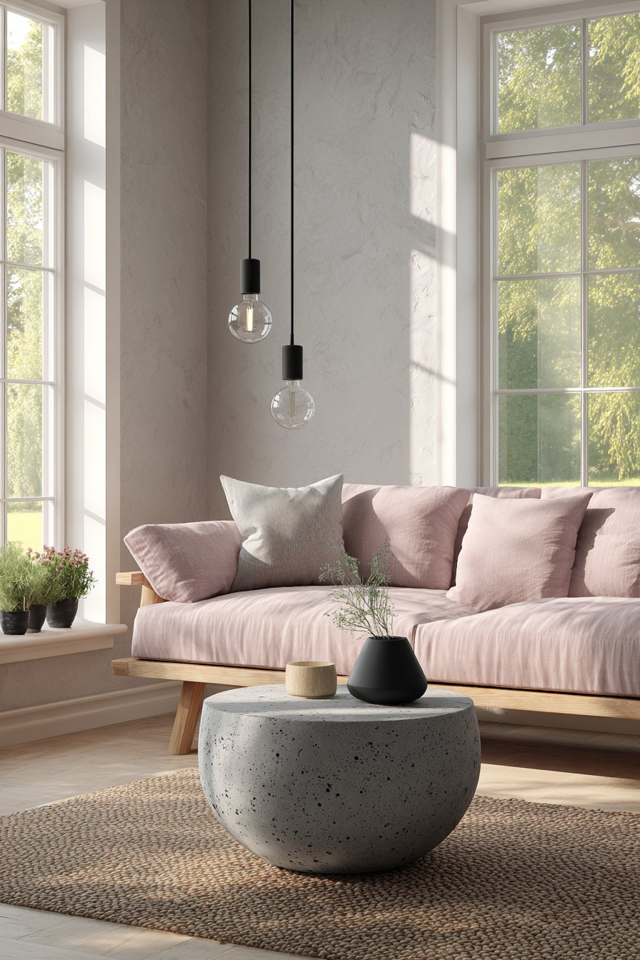 Gentle warmth characterizes this design’s approachable sophistication. The blush tone brings femininity without sweetness. The concrete table grounds the soft color with industrial strength. The jute rug adds natural texture that bridges materials. This careful balance creates universally appealing spaces.