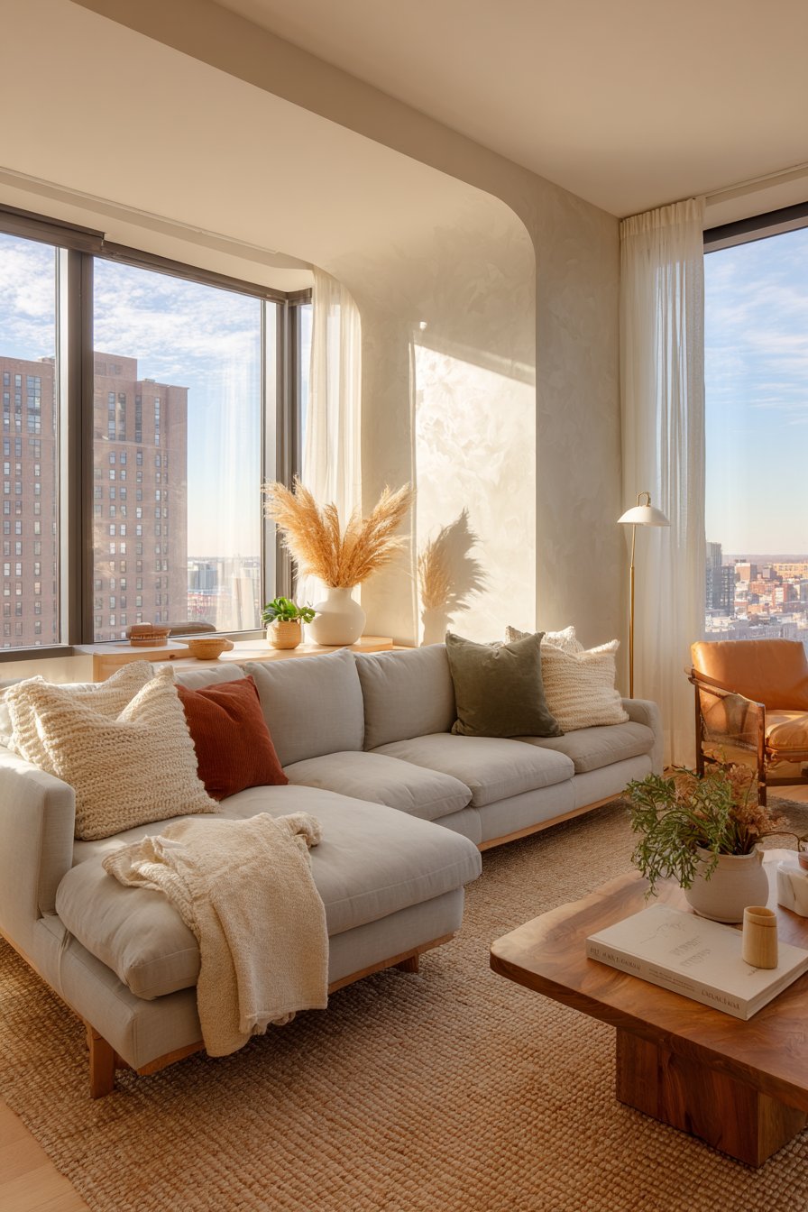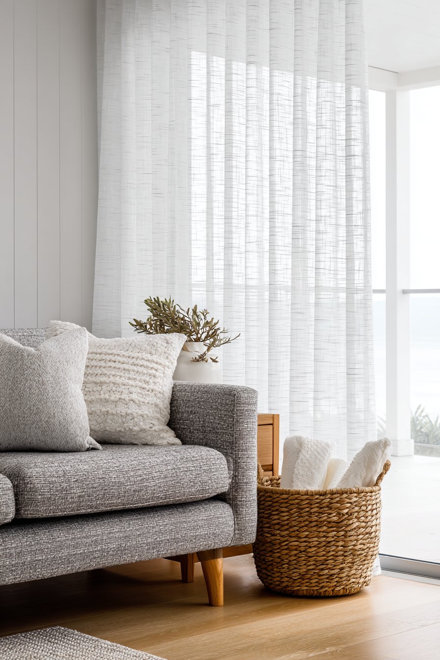 Warm afternoon sunlight filters through sheer white linen curtains, creating soft shadows across the space. The light oak hardwood flooring reflects this natural illumination beautifully. A handwoven jute rug with subtle texture variations anchors the seating area. The rug’s neutral tone complements the overall palette while adding warmth underfoot.