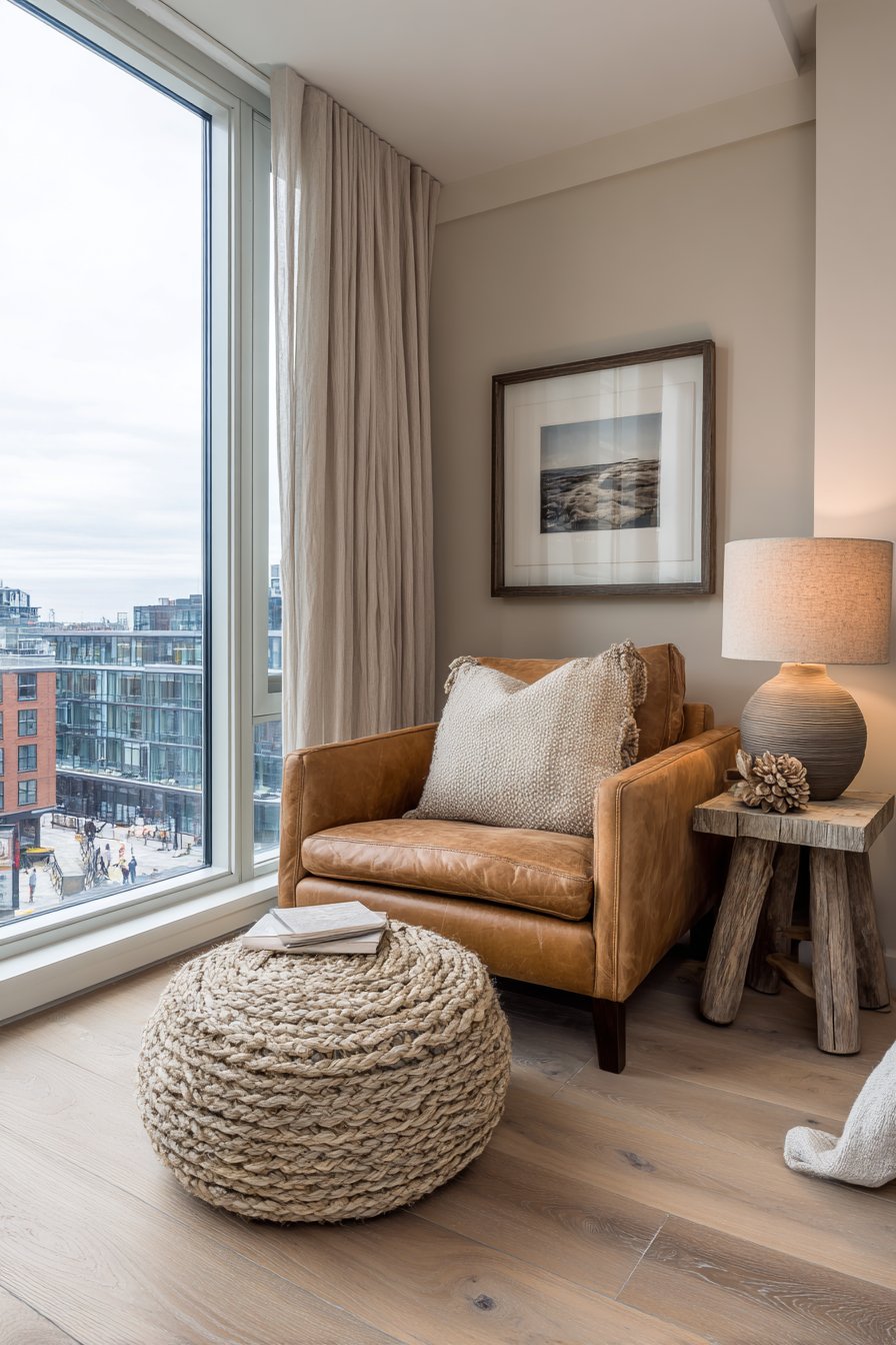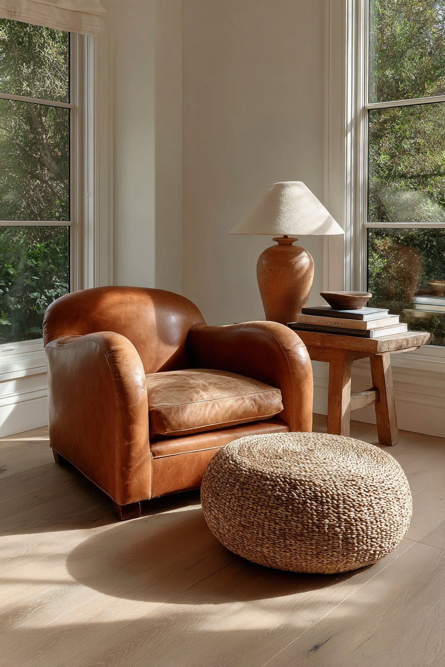 Intimate comfort emerges from this carefully composed reading corner. The caramel leather invites hours of comfortable reading. The jute ottoman provides support without visual weight. Natural and artificial light combine for perfect reading conditions. This approach shows how minimalist principles scale to any space size.