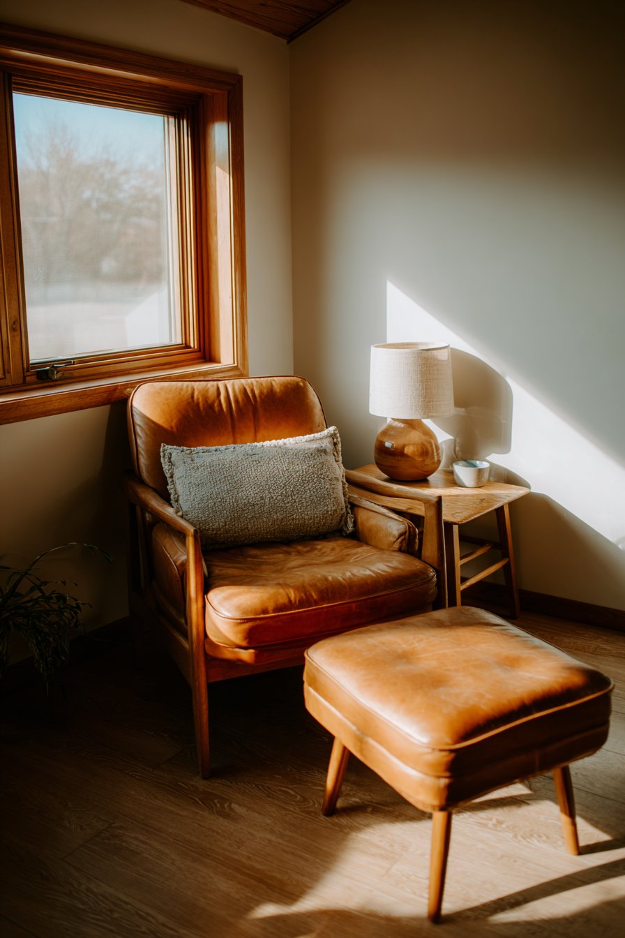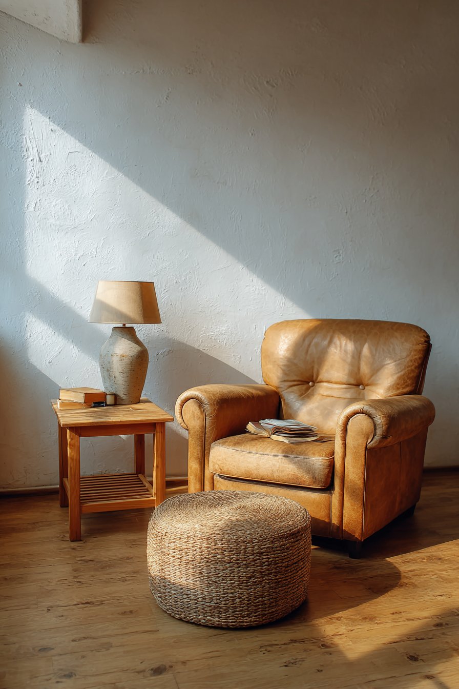 A comfortable reading corner features a single armchair in warm caramel leather. The leather shows visible grain and natural wear that adds character. A simple wooden side table holds essential items within reach. A ceramic lamp with linen shade provides warm focused lighting.