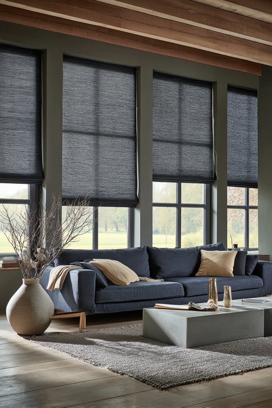 Large windows with simple roller shades in natural fabric frame abundant natural light. The shades provide privacy when needed while maintaining the clean aesthetic. The navy sofa demonstrates how one deeper color can anchor a neutral palette. This creates visual interest while preserving the overall sense of calm.