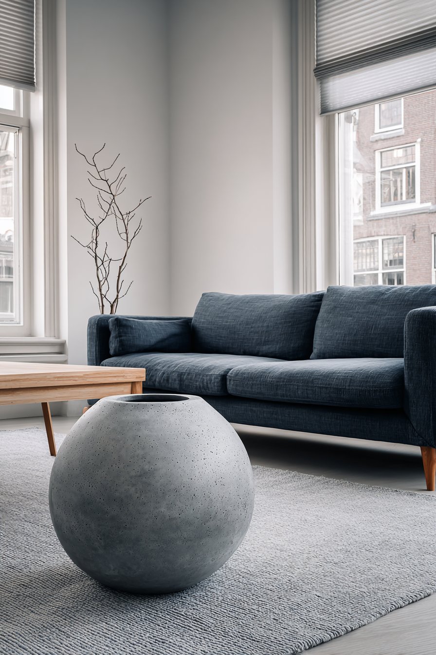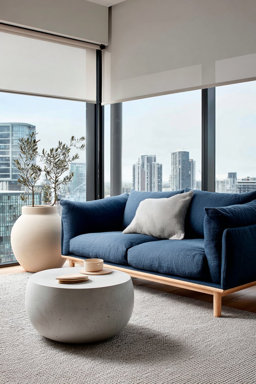 A contemporary three-seater sofa in deep navy blue linen brings sophisticated depth to this minimalist space. The rich color provides visual anchor without heaviness. Simple wooden legs in natural beech maintain lightness beneath the substantial seating. A handcrafted concrete coffee table with rounded edges adds sculptural interest through materiality.