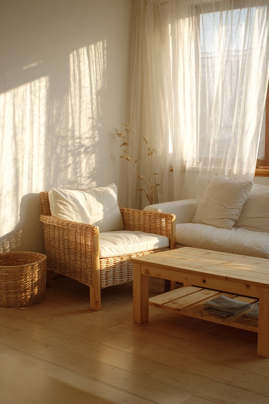 A simple wooden coffee table made from reclaimed pine displays beautiful wood grain variations. Each board tells a story through knots, color shifts, and natural markings. A natural fiber basket tucked beside the sofa provides discrete storage. Golden hour sunlight streams through sheer curtains, creating warm highlights across surfaces.
