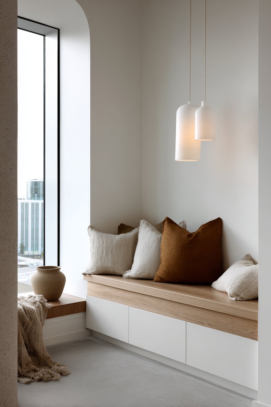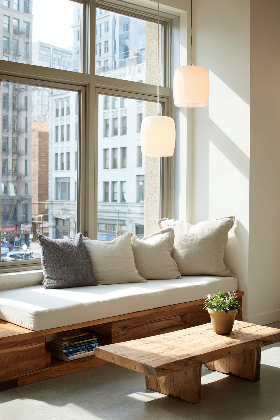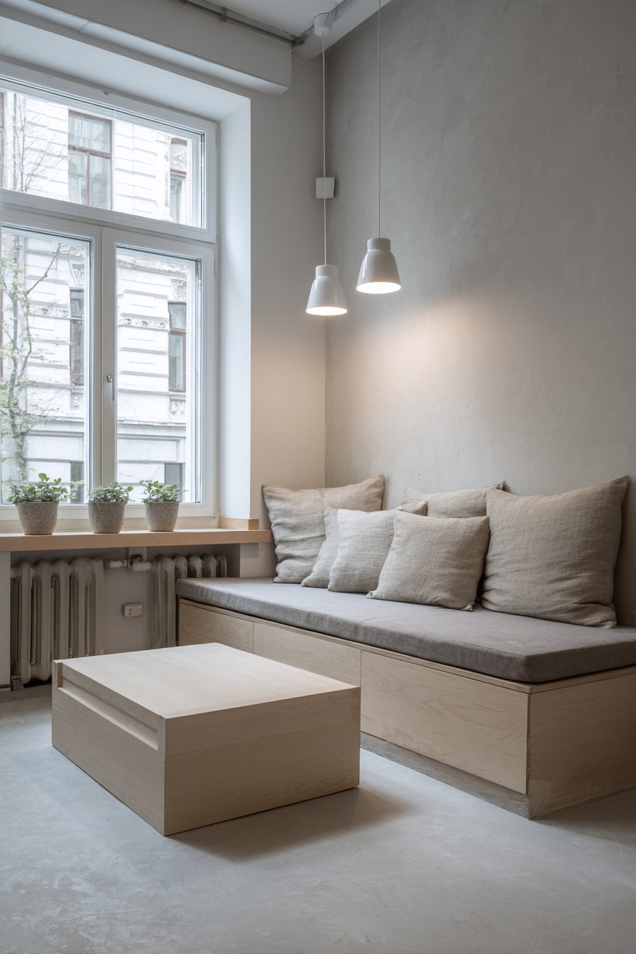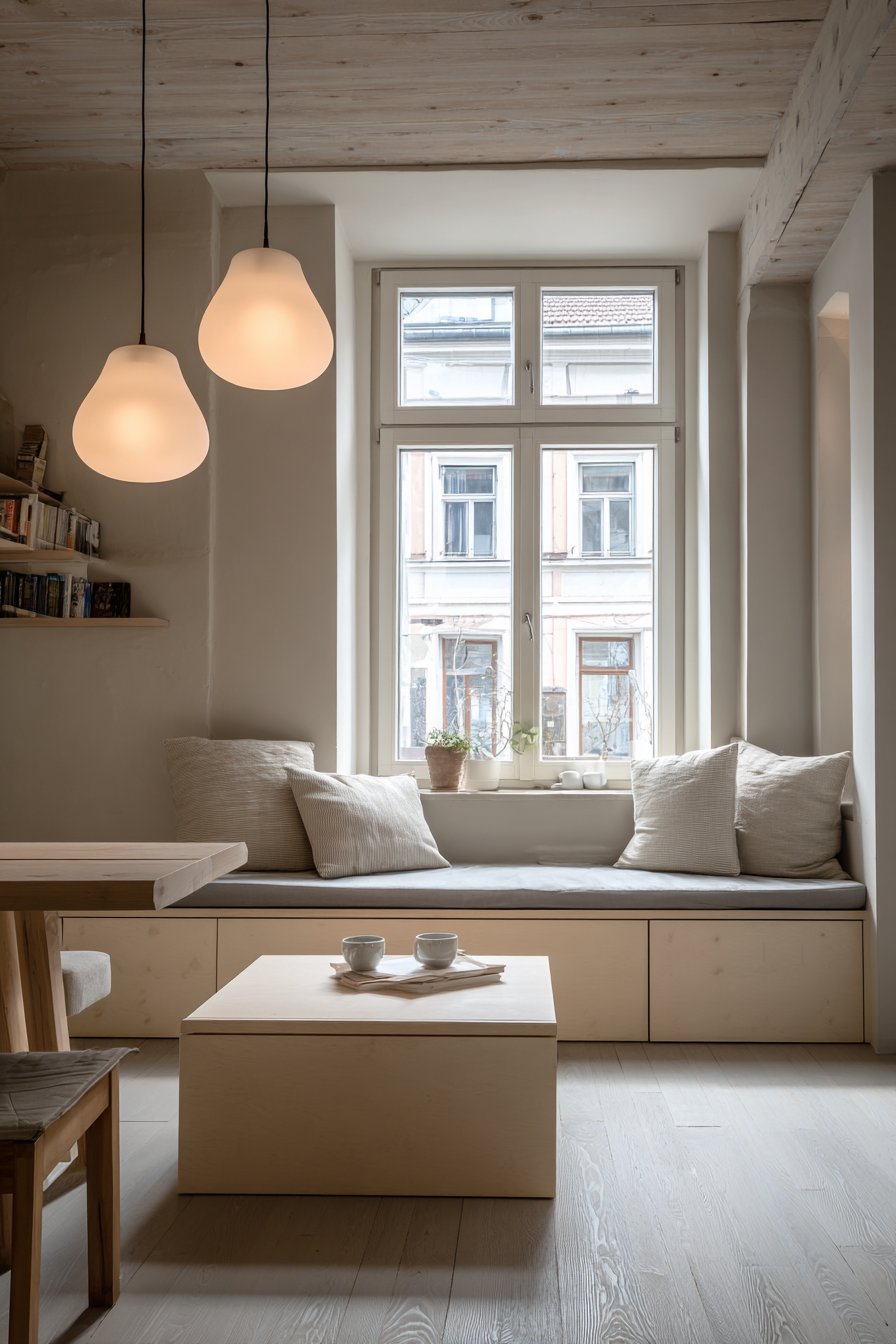 Built-in bench seating with simple cushions in natural linen creates a window seat bathed in daylight. The bench includes hidden storage beneath for practical functionality. This approach maximizes space efficiency while maintaining clean lines. A low rectangular coffee table in light ash wood complements the built-in seating.