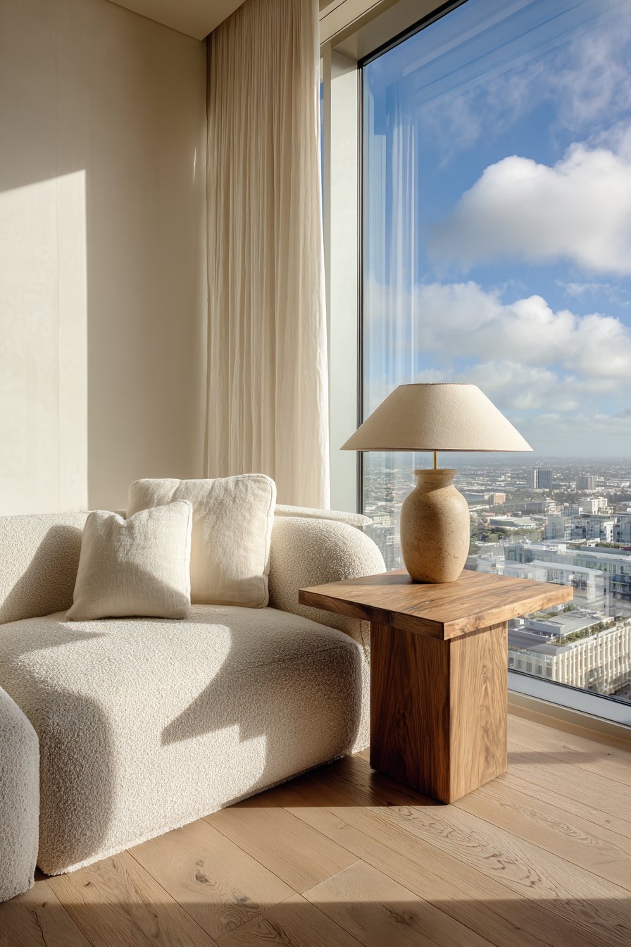 A ceramic table lamp with natural linen shade provides warm task lighting. Wide plank white oak flooring reflects soft morning light throughout the space. Floor-to-ceiling windows dressed in sheer white fabric maximize natural illumination. The spacious feel comes from thoughtful proportions and abundant light.