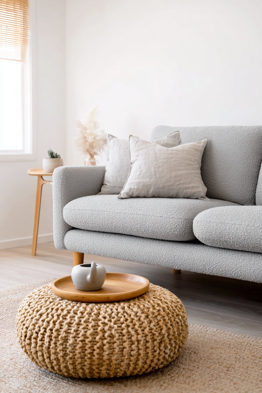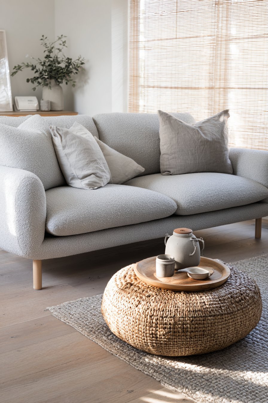 Texture-rich simplicity defines this design’s sophisticated approach. The bouclé fabric invites touch while maintaining clean lines. The jute pouf brings handcrafted quality to functional furniture. Multiple textures prevent the neutral palette from feeling flat. This layering creates depth without visual complexity.