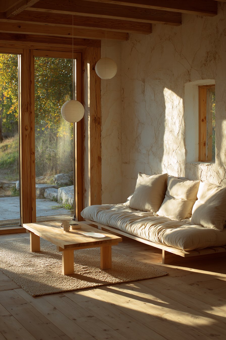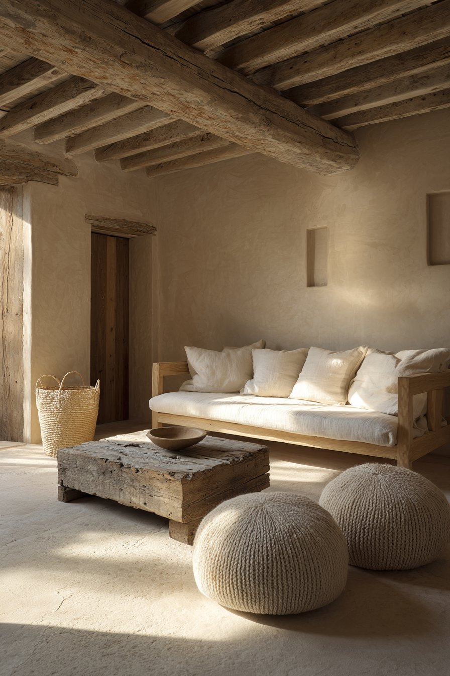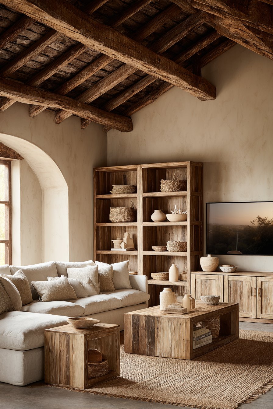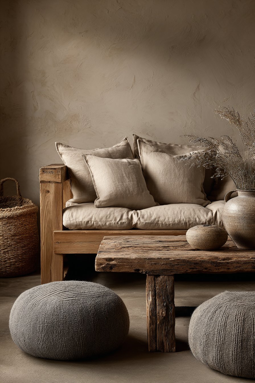 Behind the sofa, a console table in reclaimed wood displays simple accessories. Ceramic vases and wooden bowls create sculptural compositions without clutter. Soft natural lighting from large windows bathes the entire space in warmth. This arrangement demonstrates how organic materials create inviting comfort.