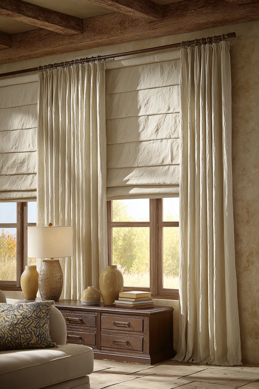 Linen Roman shades in natural oat color layer beneath flowing floor-length curtains. The dual treatment provides flexible light control and visual softness. Simple wooden curtain rods in warm tones complete the natural aesthetic. The layered approach adds dimensional luxury to window dressing.