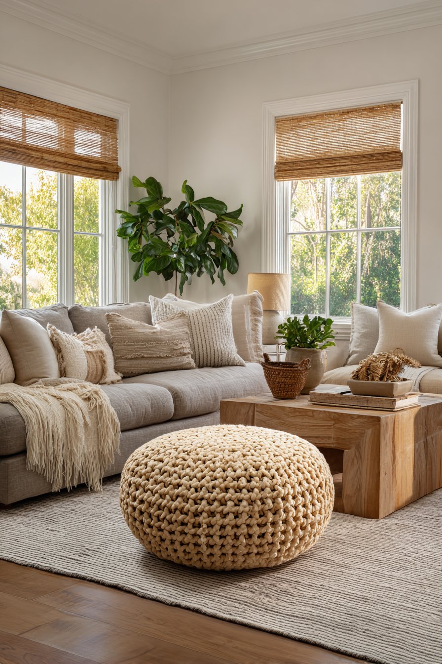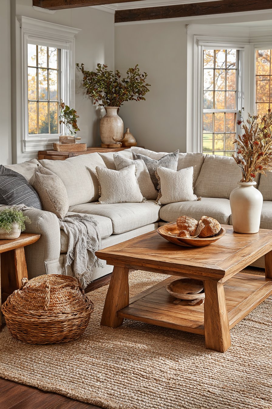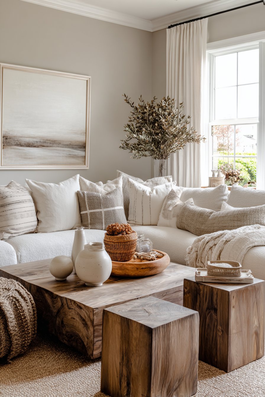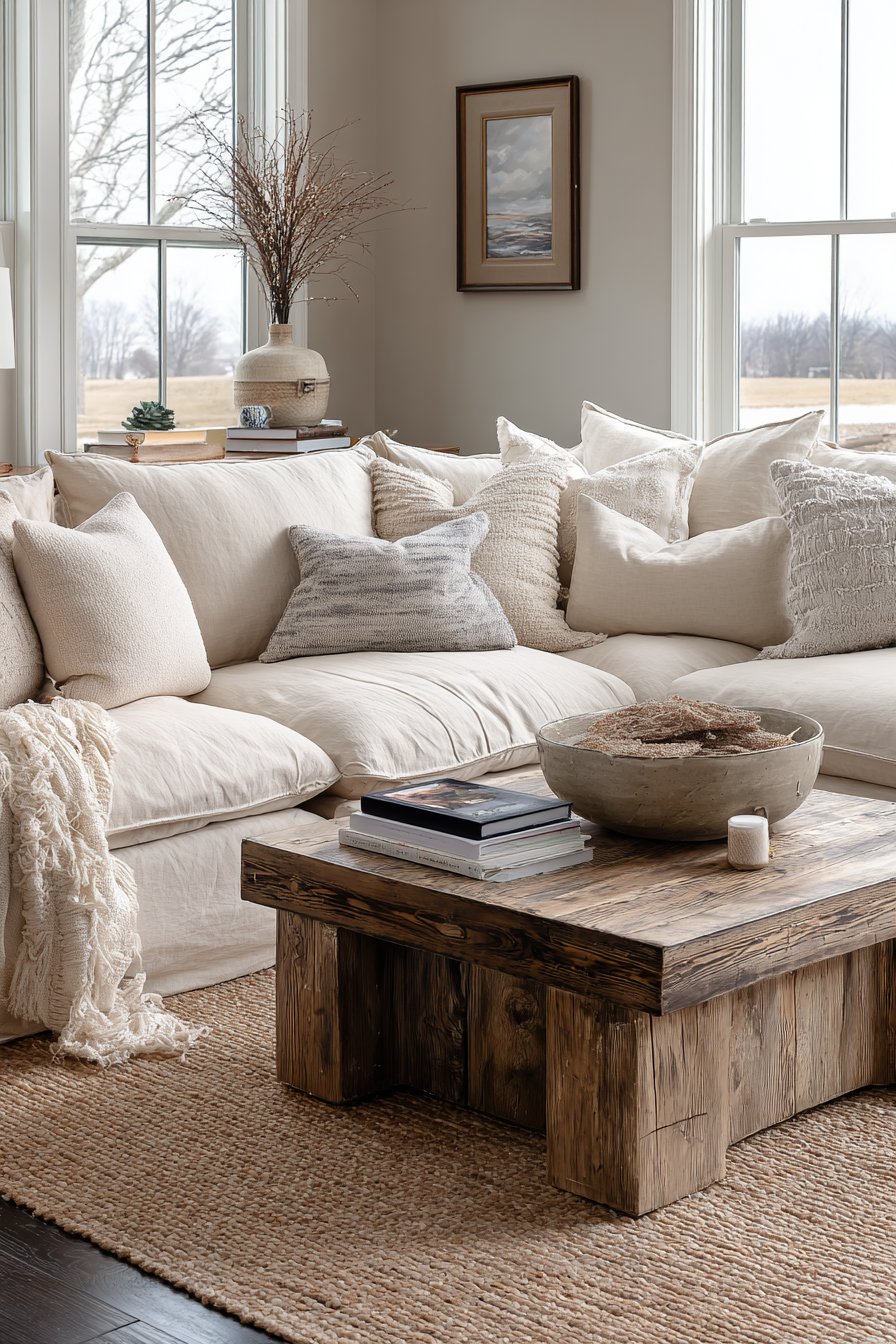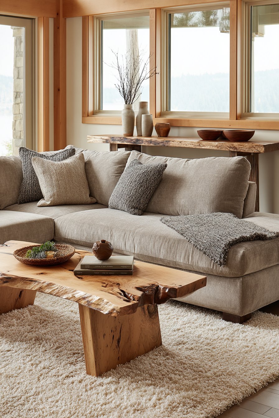 A large sectional in warm sand linen provides neutral foundation for wood variety. Walls painted in soft greige with warm undertones complement all wood tones. A jute rug with natural color variation adds textural foundation. The organic fiber grounds the space while allowing wood variety to shine.
