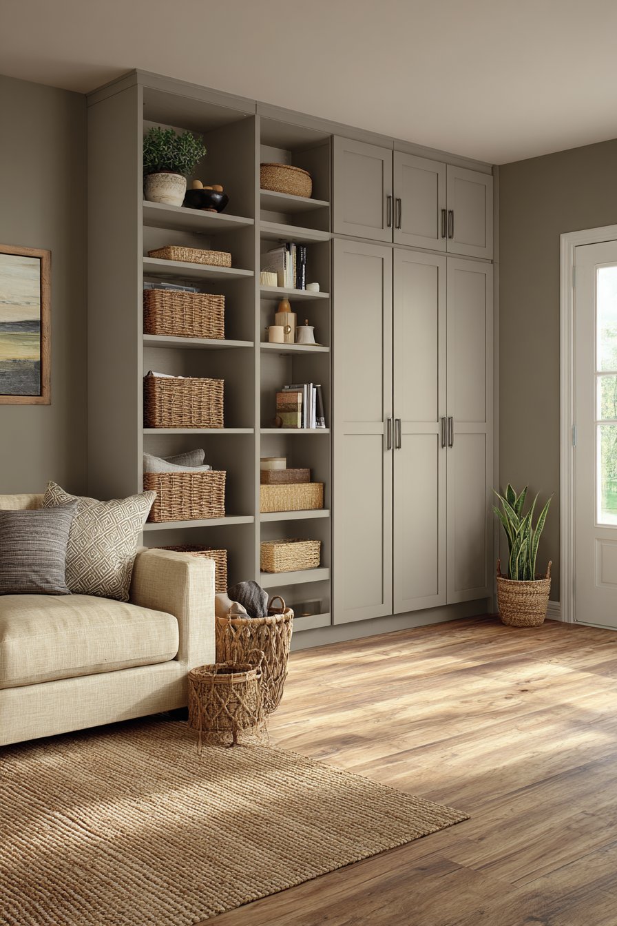 Floor-to-ceiling built-in cabinetry in painted warm greige provides extensive storage. Simple shaker-style doors maintain traditional elegance while offering concealment. Open shelving sections display books, baskets, and decorative objects. The coordinating neutral tones create cohesive visual harmony throughout.