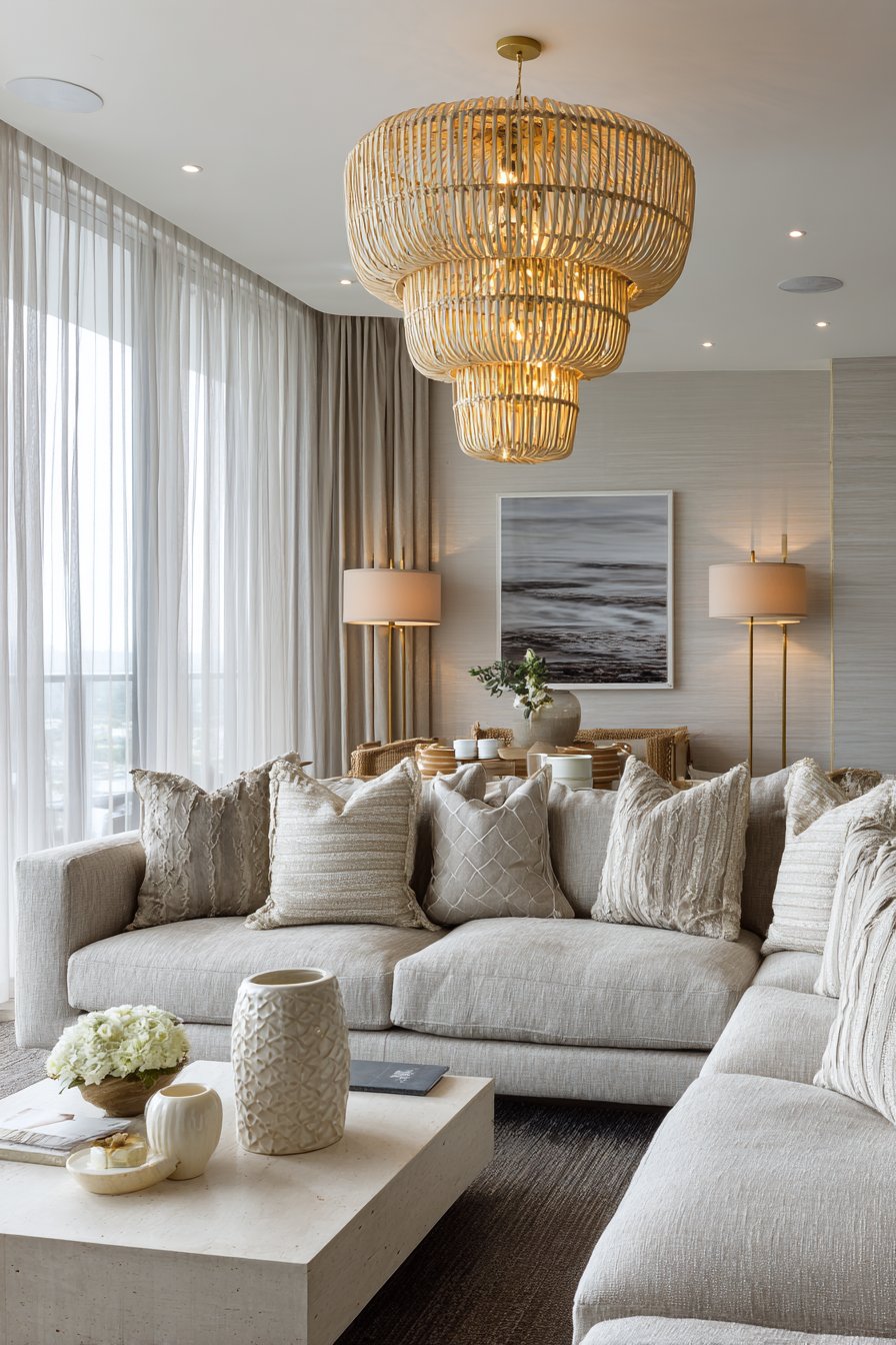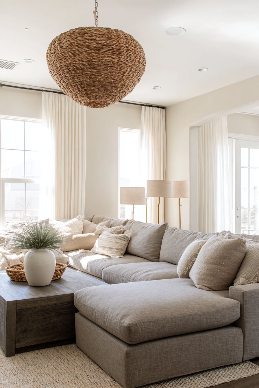 A large woven pendant light in natural rattan creates sculptural focal point overhead. Interesting shadows cast by the weaving add dynamic visual element. Simple brass floor lamps with neutral linen shades flank the sectional sofa. The varied light sources create dimensional illumination throughout the space.