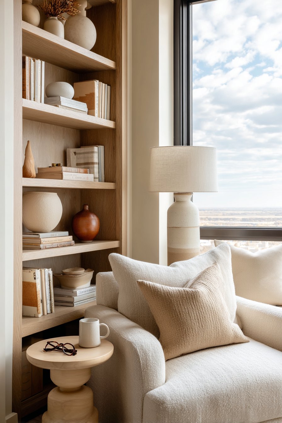 Natural oak built-in shelving frames a comfortable reading sanctuary near large windows. Books and ceramic accessories in cream and terracotta tones create curated displays. The wood’s honest grain patterns bring warmth without overwhelming the neutral palette. Each shelf becomes both functional storage and artistic composition.
