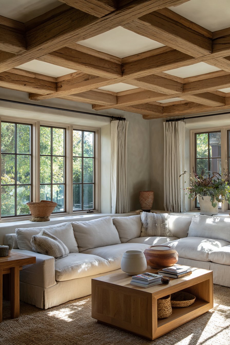 A low-profile sectional in natural linen anchors the space beneath dramatic beams. Simple wooden side tables and a limestone coffee table add organic elements. A large wool area rug in cream with subtle pattern provides softness underfoot. The natural materials work harmoniously together throughout.