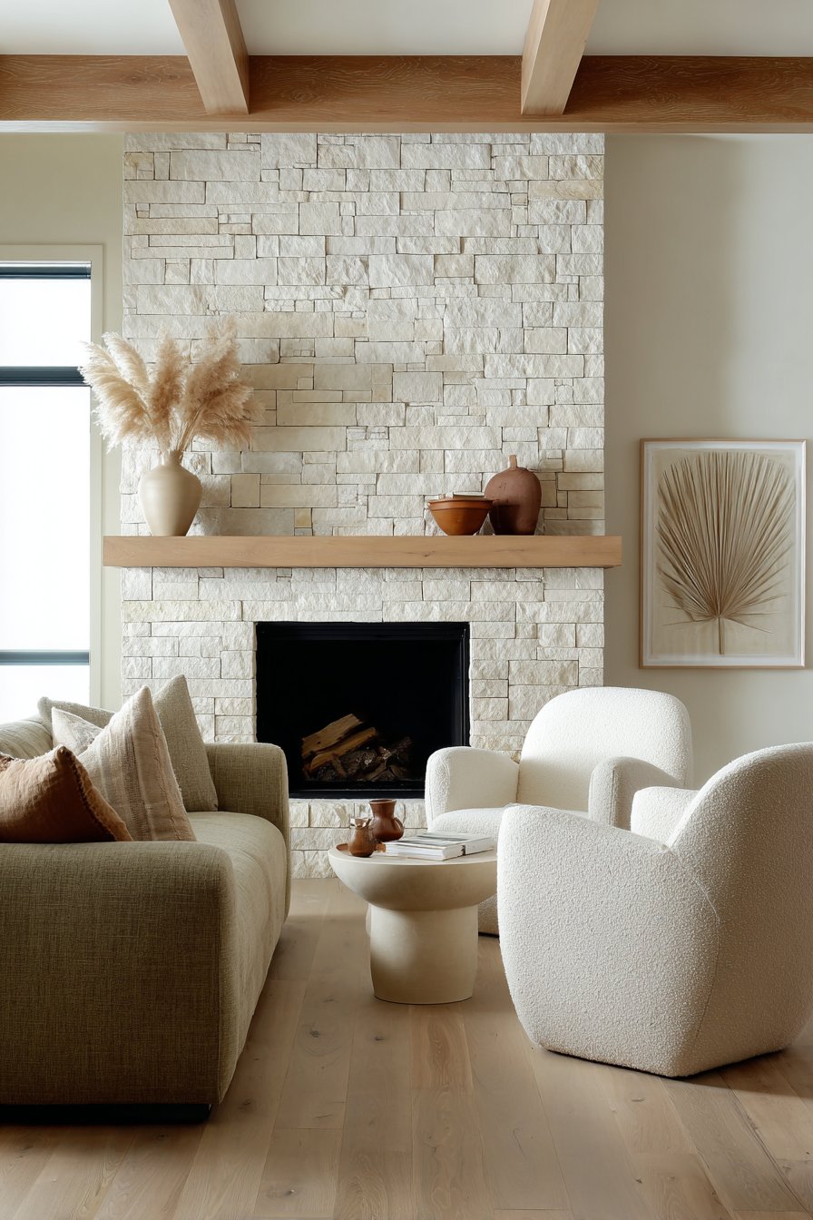 A low-profile sofa in sand-colored performance fabric faces a stunning limestone fireplace. The natural stone’s subtle variations create organic visual interest. A simple wooden mantel displays carefully curated natural elements with restraint. Dried pampas grass in ceramic vases brings organic softness to the architectural feature.