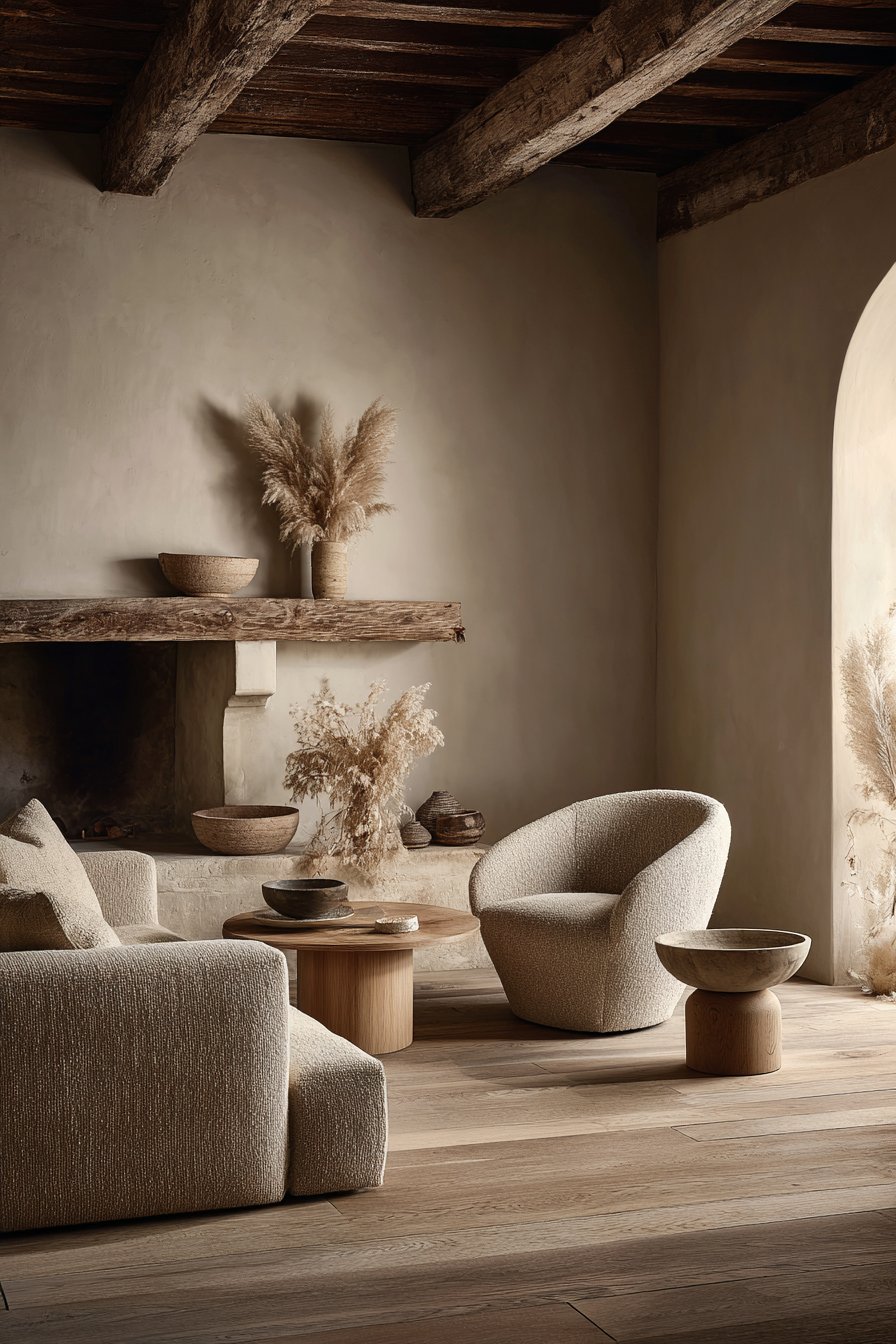 Two accent chairs in warm taupe linen flank the fireplace symmetrically. This arrangement encourages conversation while maintaining visual balance. Wooden bowls on the mantel add sculptural interest without fussiness. The combination creates a focal point that feels both designed and naturally evolved.