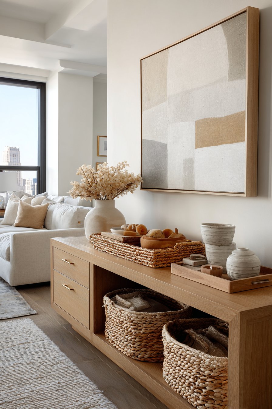 A natural oak media console features clean lines and brushed brass hardware. The wood’s authentic grain patterns create visual warmth against painted walls. Above hangs a large abstract artwork in soft neutrals that anchors the entire wall. Cream, beige, and warm grey tones in the art tie together surrounding elements.