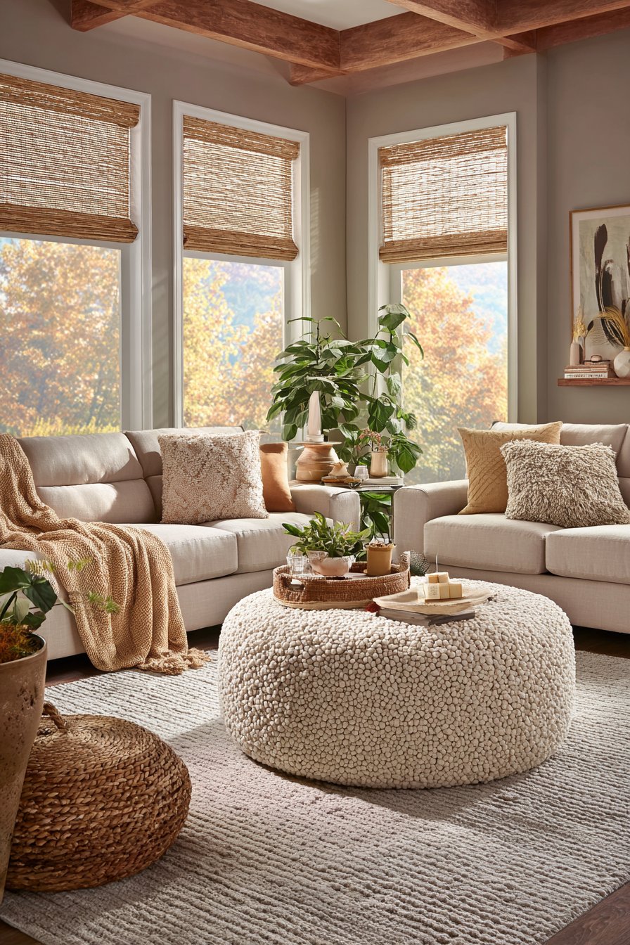 A natural wool flatweave rug with subtle stripe pattern grounds the entire grouping. Large windows dressed in bamboo Roman shades diffuse natural light beautifully. The shades filter harsh sun while maintaining connection to the outdoors. This arrangement proves that conversation-focused layouts create the coziest living spaces.