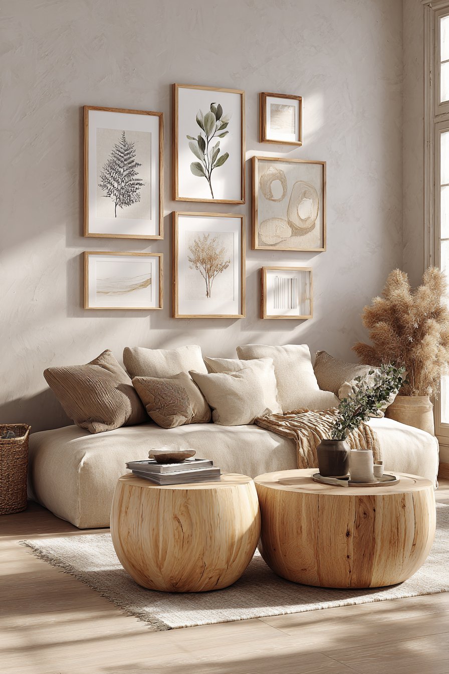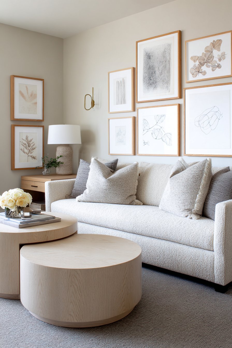 Below the gallery wall sits a low-slung sofa in warm sand linen. The visible fabric texture adds dimensional quality to the simple silhouette. Two round nesting coffee tables in light ash wood provide flexible surface options. Their varied heights create functional versatility for different activities.