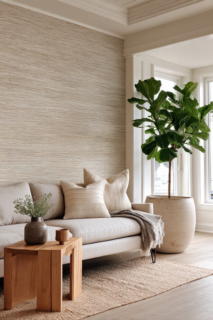 A textural accent wall in grasscloth wallpaper creates immediate visual impact. Natural fiber variations in warm beige tones add organic sophistication. The wall becomes both backdrop and focal point simultaneously. Against this sits a streamlined sofa in stone-colored linen with clean track arms.