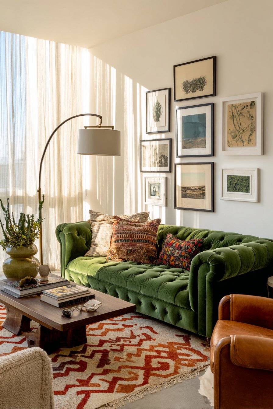 A vintage Chesterfield sofa in deep emerald green velvet anchors this stunning living room. The rich texture provides luxurious comfort and visual weight. Paired with a mid-century modern walnut coffee table, the combination feels both timeless and fresh. The contemporary geometric area rug in burnt orange and cream ties everything together beautifully.