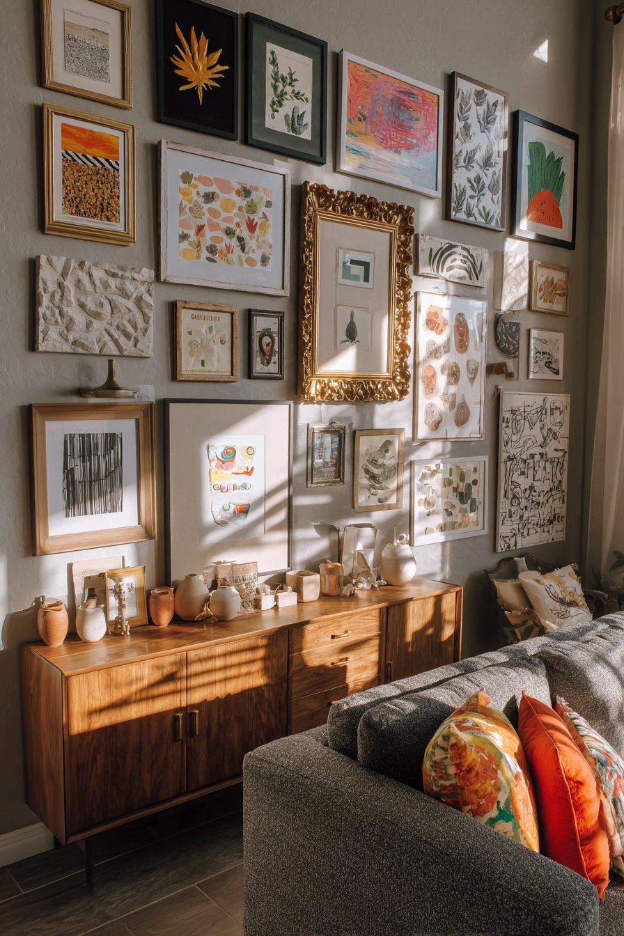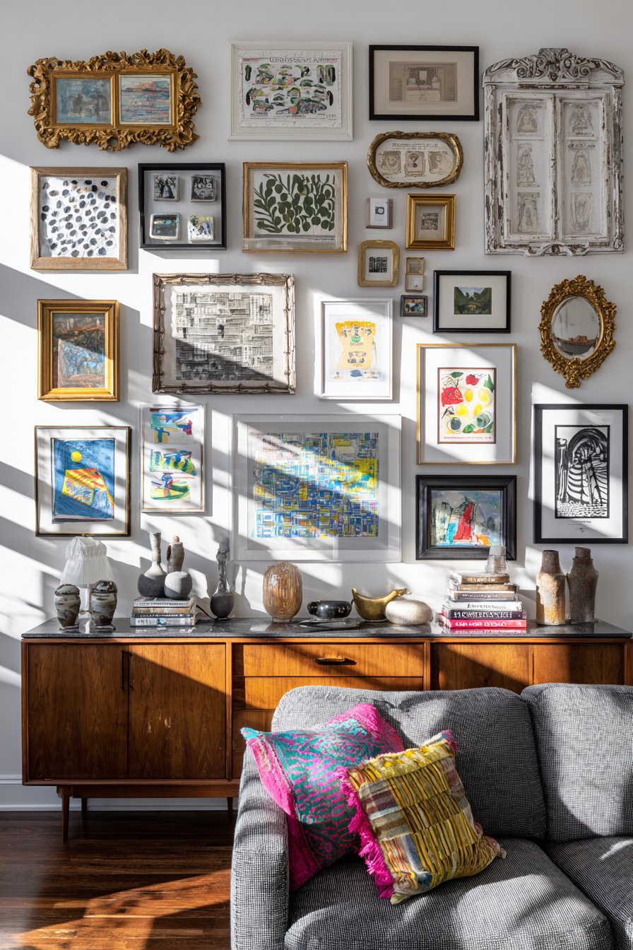 The walls showcase a curated gallery of mismatched vintage frames. Abstract art mingles with botanical prints and black-and-white photography. Each piece contributes to the collected-over-time aesthetic. The varied frame styles add depth and interest without overwhelming the space.
