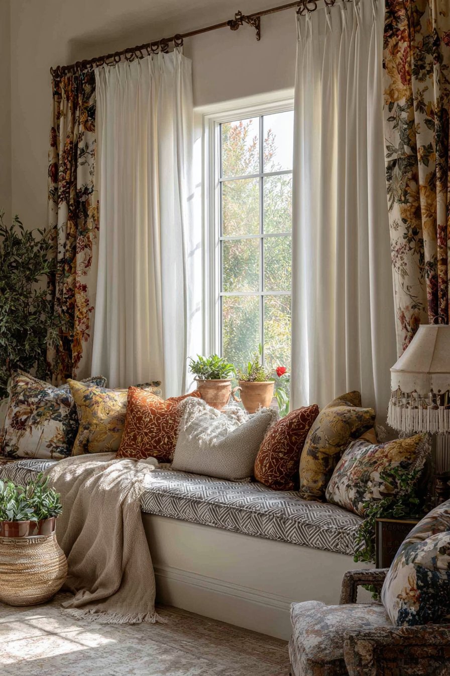 Contemporary geometric fabric covers the seat cushion. An assortment of throw pillows in varying patterns tops the cushion. Small potted plants line the windowsill in mismatched ceramic containers. Natural morning light filters through the layered curtains creating soft, warm glow.