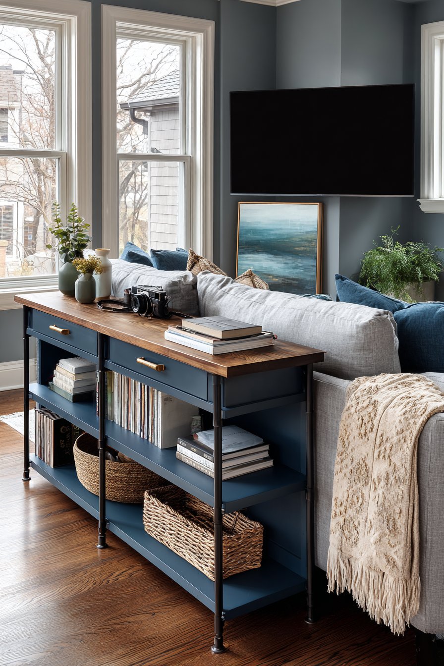 A vintage dresser painted in deep navy blue serves as the media center. Original brass hardware is polished to a brilliant shine. The repurposed furniture adds character and sustainability. A modern flat-screen TV sits alongside eclectic decorative objects.