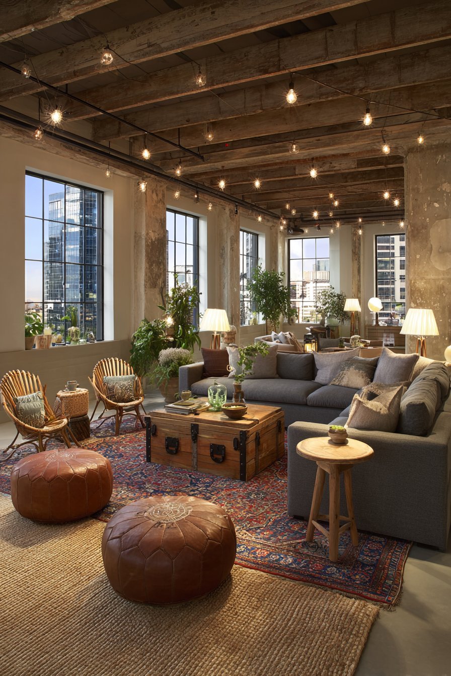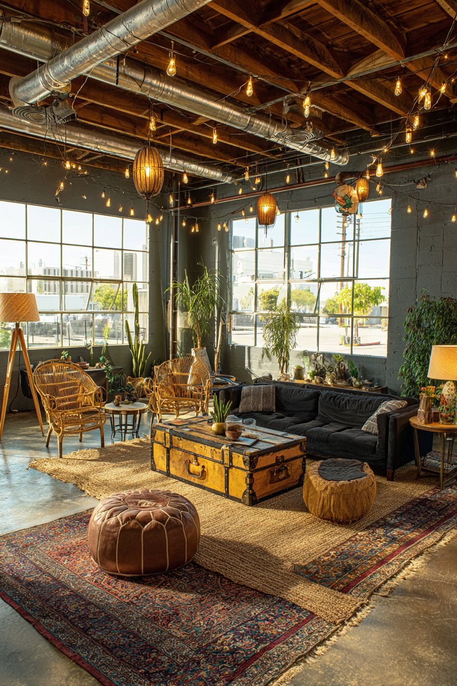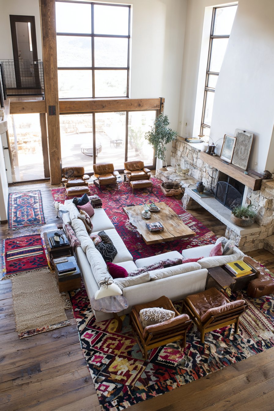 Furniture includes a modern sectional sofa and vintage leather chairs. A live-edge wood coffee table bridges the style gap. Large windows with minimal treatments allow natural light to highlight floor coverings. The layering strategy successfully grounds the eclectic furniture mix.