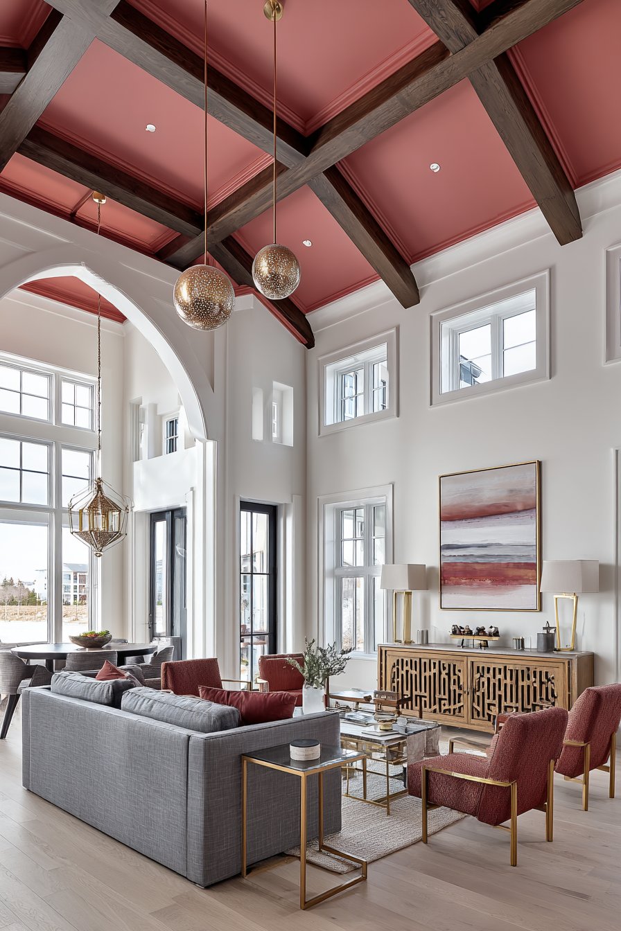 Exposed wooden beams stained in dark walnut create architectural interest. Between the beams, the ceiling is painted in unexpected soft coral pink. The bold ceiling treatment draws the eye upward. From the beams hang eclectic pendant lights at varying heights.