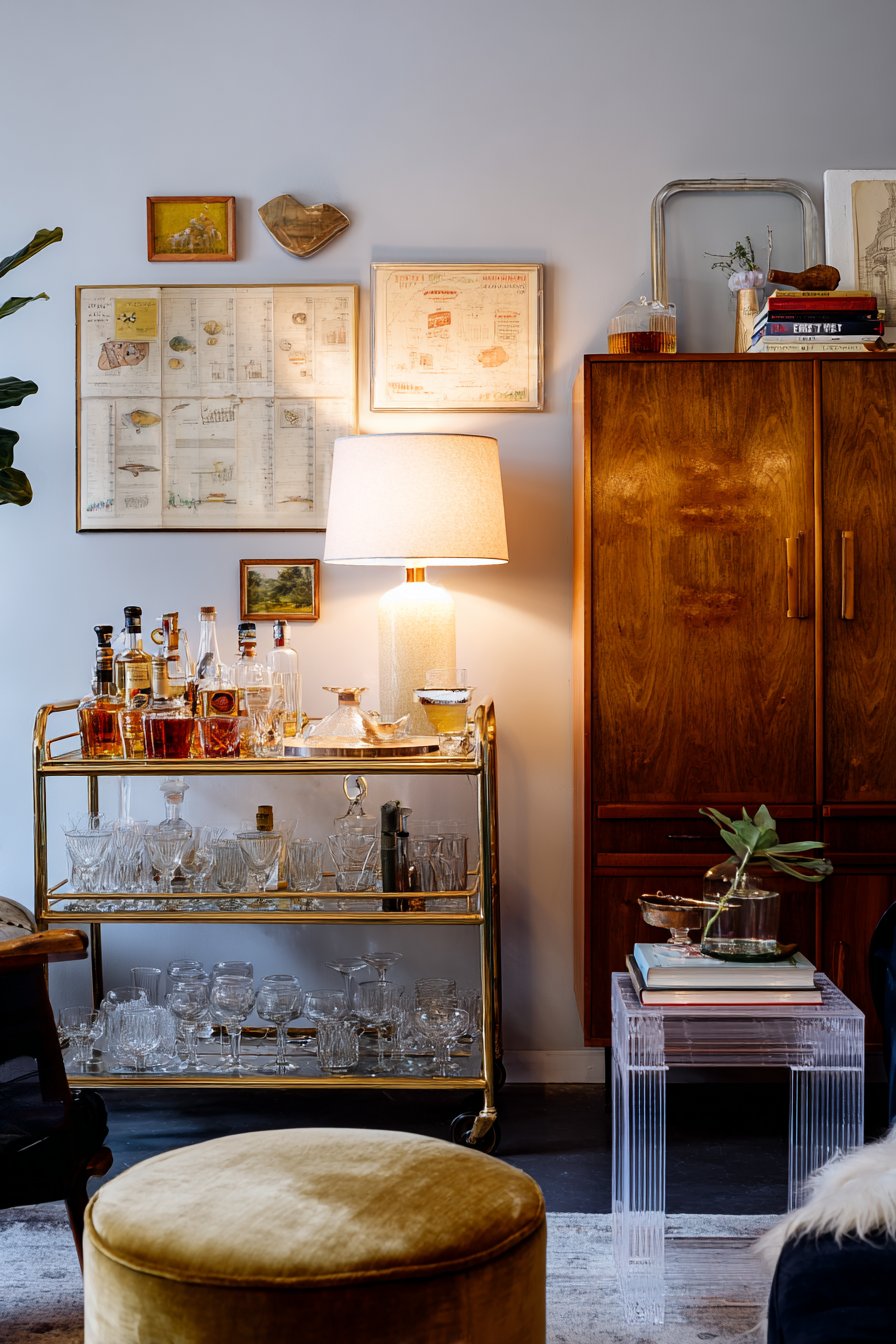 A vintage brass bar cart with glass shelves displays glassware collections. Decanters and bottles with varied shapes and colors create visual interest. Next to it stands a tall mid-century modern cabinet in teak. Sliding doors conceal storage while the top displays accessories.
