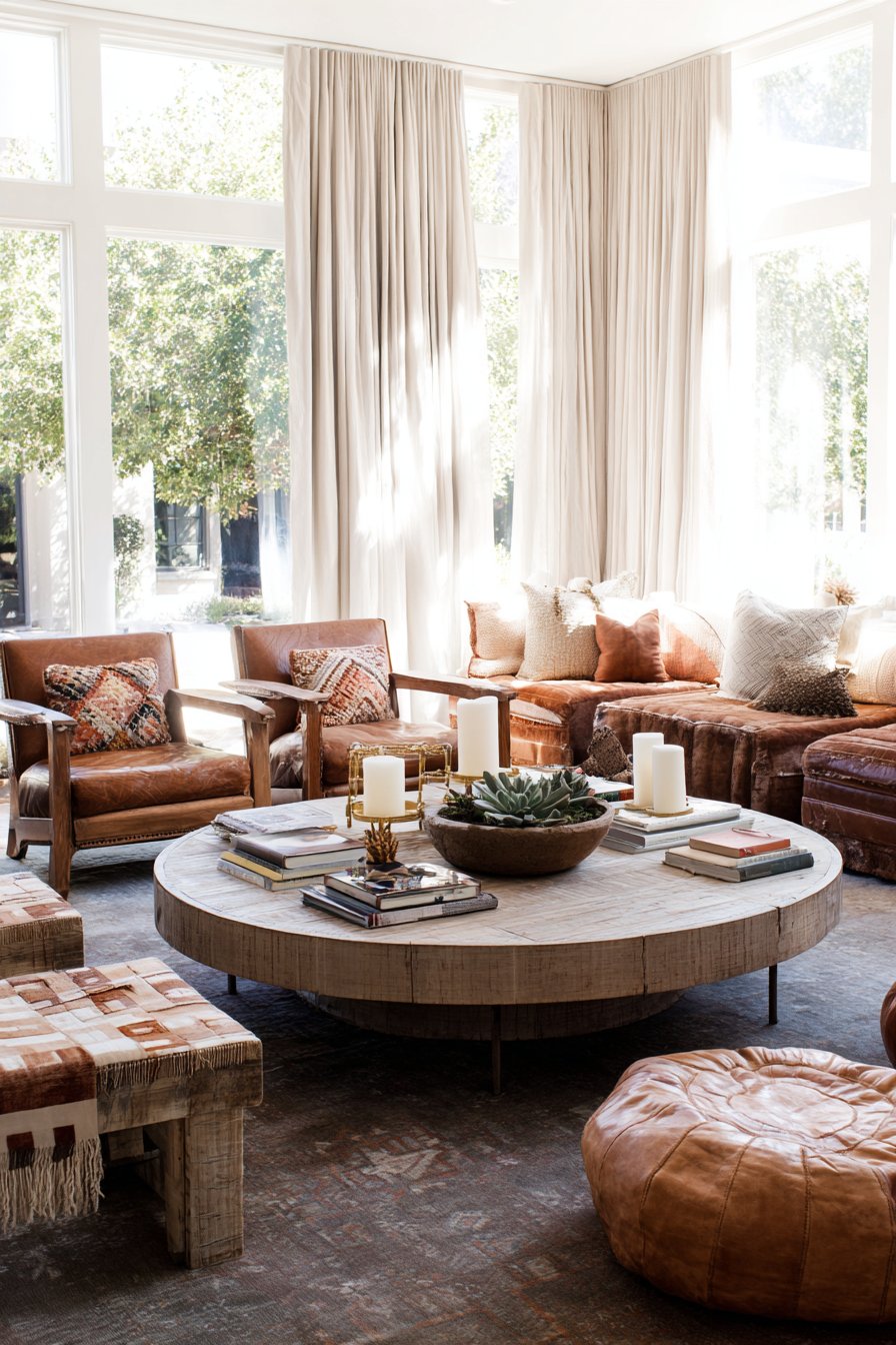 A contemporary pouf in woven textile offers additional flexible seating. At the center sits a large round coffee table. Reclaimed wood with a live edge and modern hairpin legs bridge styles. The table displays coffee table books, a ceramic bowl, and candles.