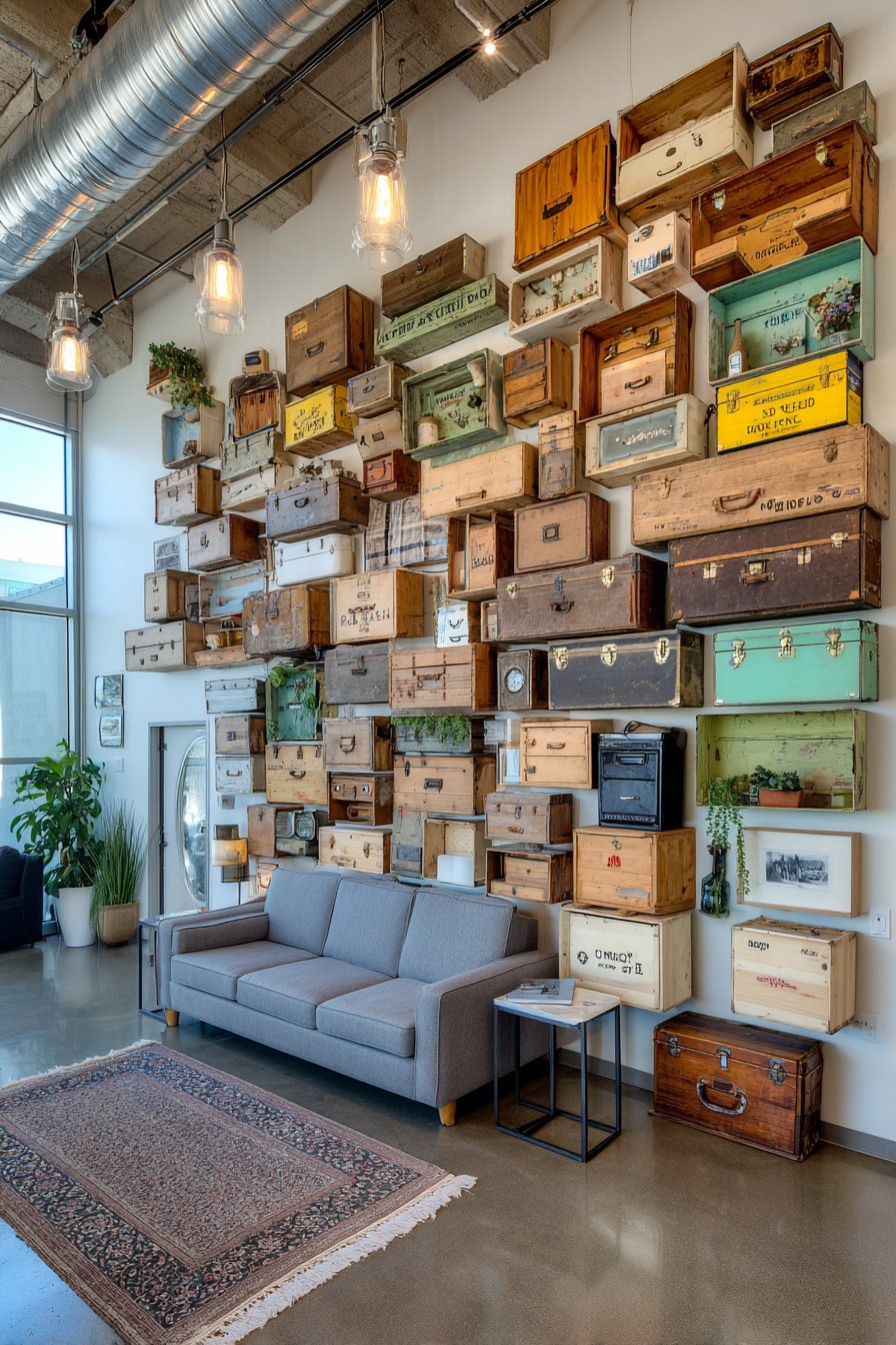 A full wall of mismatched vintage wooden crates creates functional art. Suitcases and boxes arrange in artistic composition. The storage pieces vary in size, wood tone, and style. Some are painted in muted colors while others show natural wood.