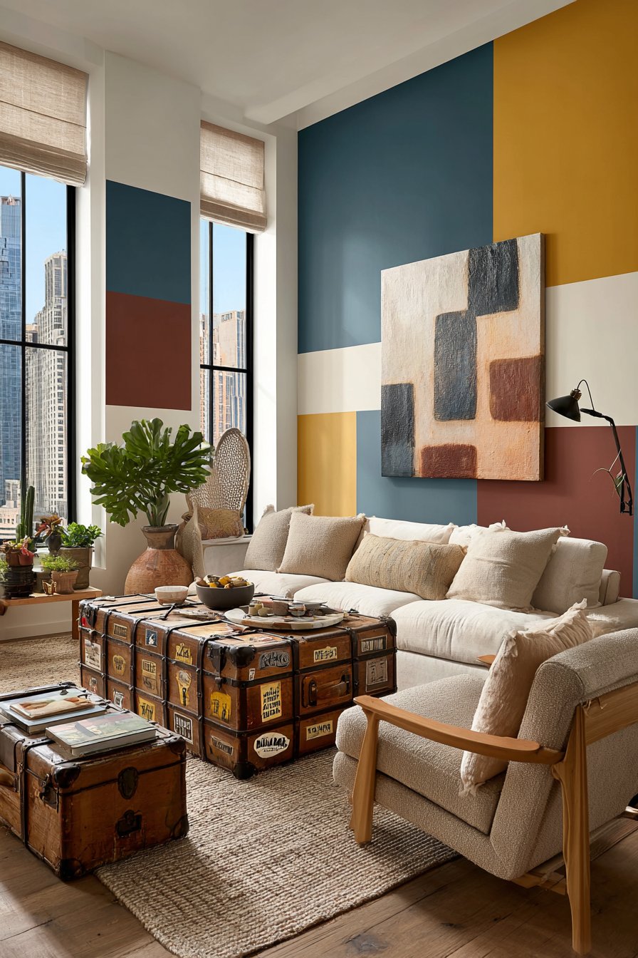 Dramatic color-blocking divides walls into geometric sections. Deep teal, burnt sienna, and cream create abstract mural effects. The bold backdrop requires carefully chosen furniture. A streamlined modern sofa in neutral oatmeal linen provides calm balance.
