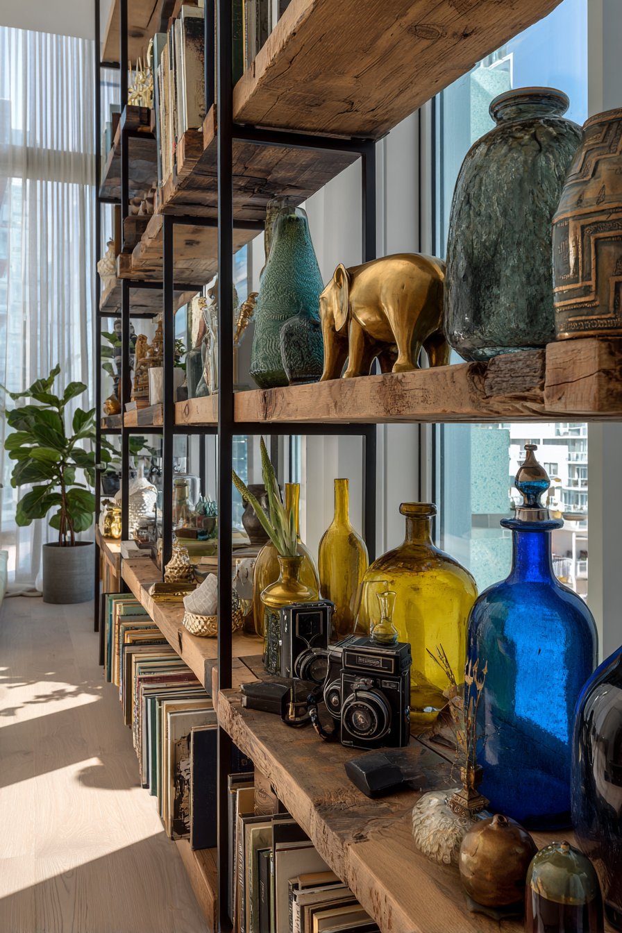 2. Industrial Bookshelf Vignette with Collected Treasures