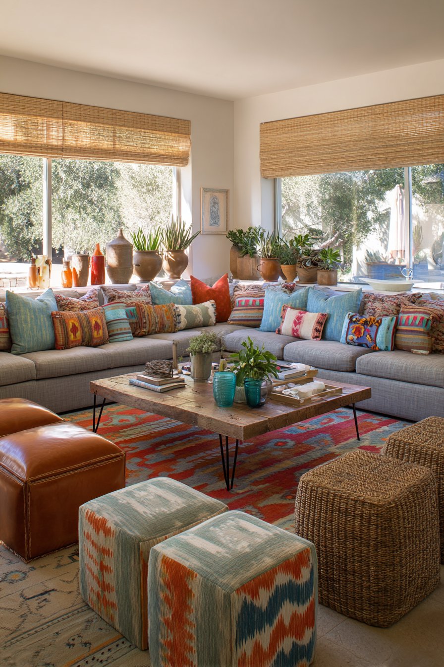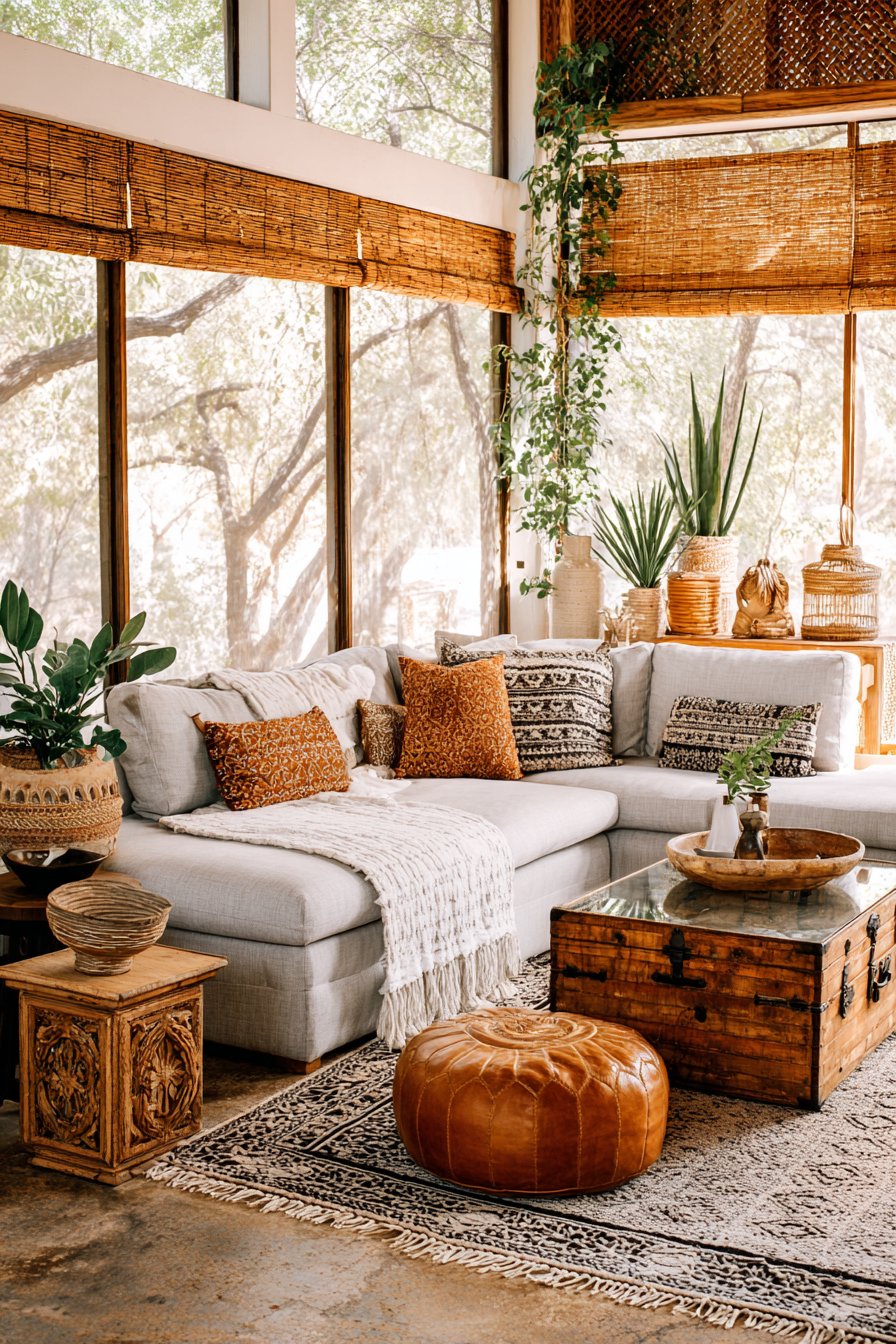 One Moroccan leather ottoman pairs with vintage fabric upholstery. A woven seagrass piece adds natural texture to the mix. Plants cluster in one corner in various ceramic and terracotta pots. Large windows with bamboo roman shades filter warm natural light throughout.