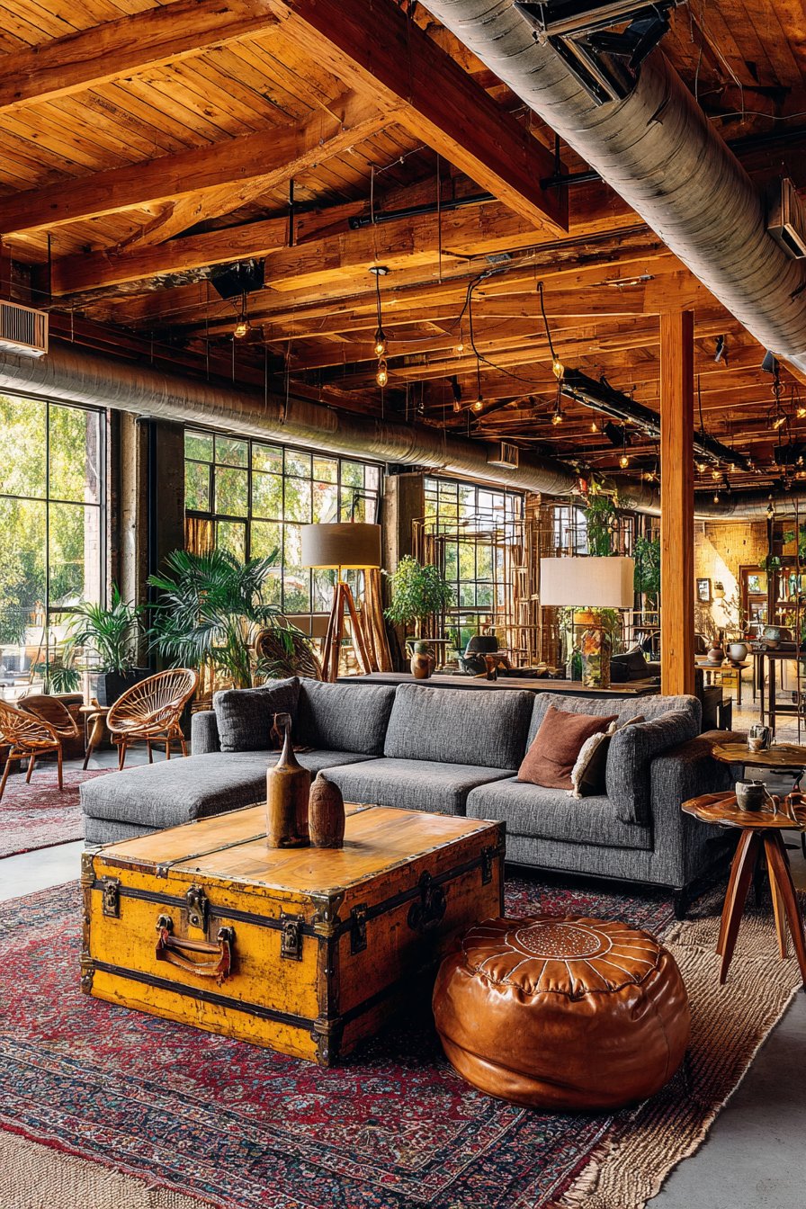 The coffee table makes a bold statement as a repurposed vintage trunk. Brass hardware and worn leather straps tell stories of past travels. Mismatched side tables surround the seating area. One features industrial metal construction while another showcases carved wooden plant stand styling.