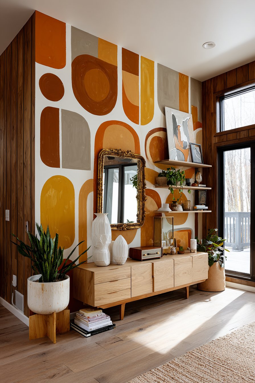 Abstract geometric patterns cover one accent wall in this striking design. Terracotta, mustard yellow, and sage green create visual drama. The hand-painted mural adds artistic personality and custom character. Opposite walls in warm off-white provide calming balance.