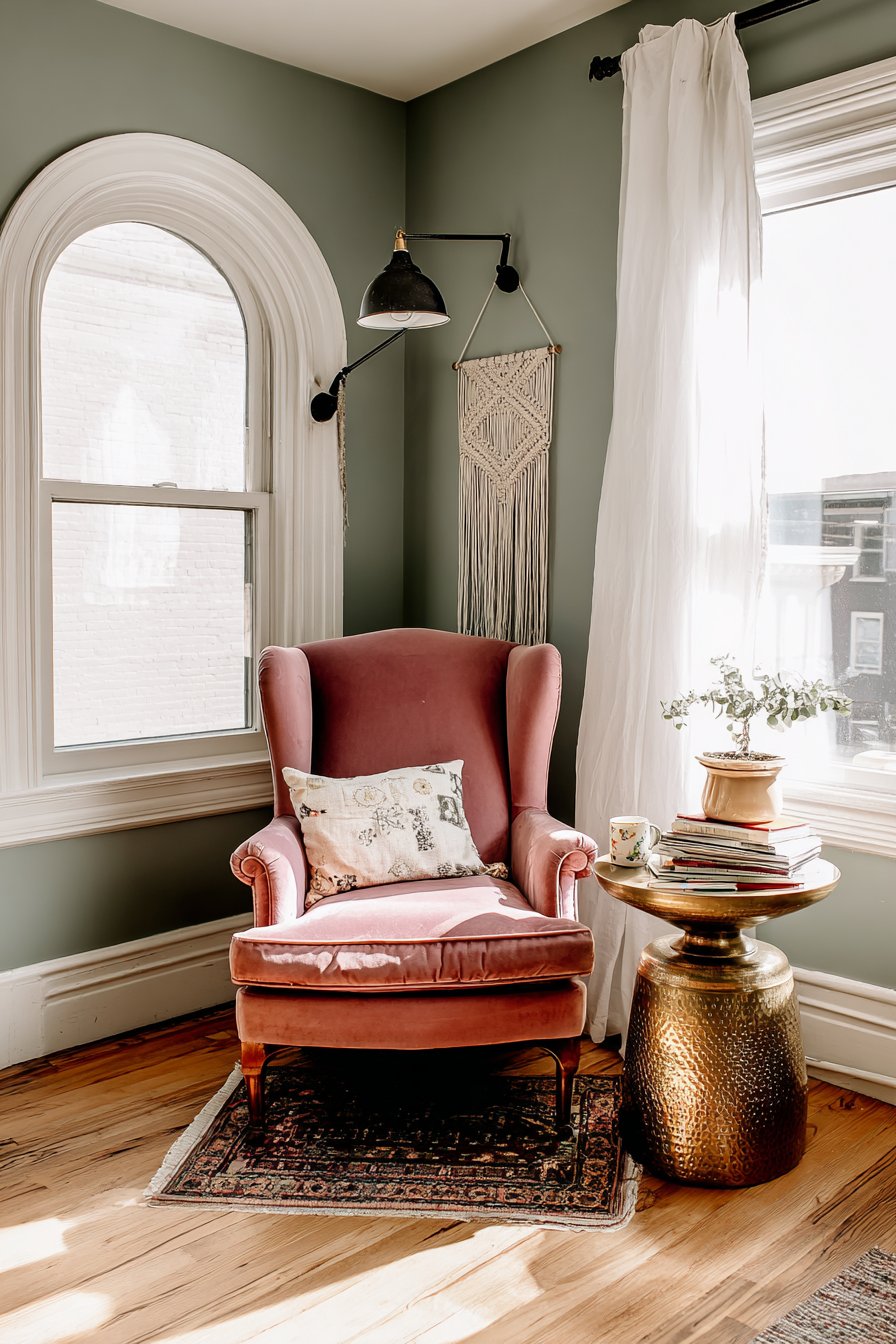 A vintage velvet wingback chair in dusty rose pink creates an intimate reading spot. Positioned beside a tall arched window, it captures natural light perfectly. Flowing white cotton curtains soften the space and filter harsh sunlight. This corner invites quiet moments with books and contemplation.