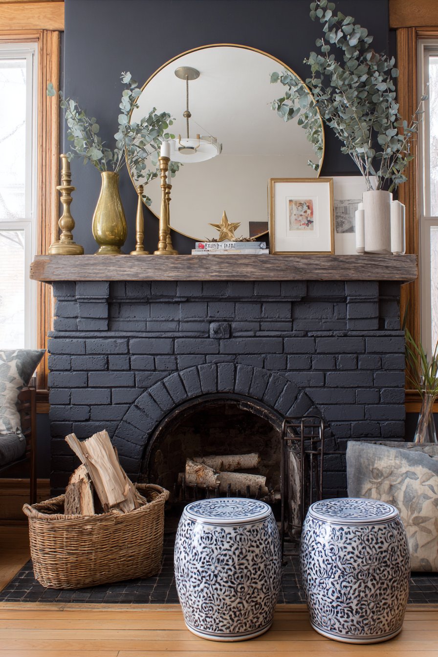 The fireplace mantel becomes a gallery for collected objects. A large round convex mirror with thin brass frame creates a focal point. Candlesticks in varying heights and finishes add vertical interest. Brass, ceramic, and turned wood pieces create pleasing variety.