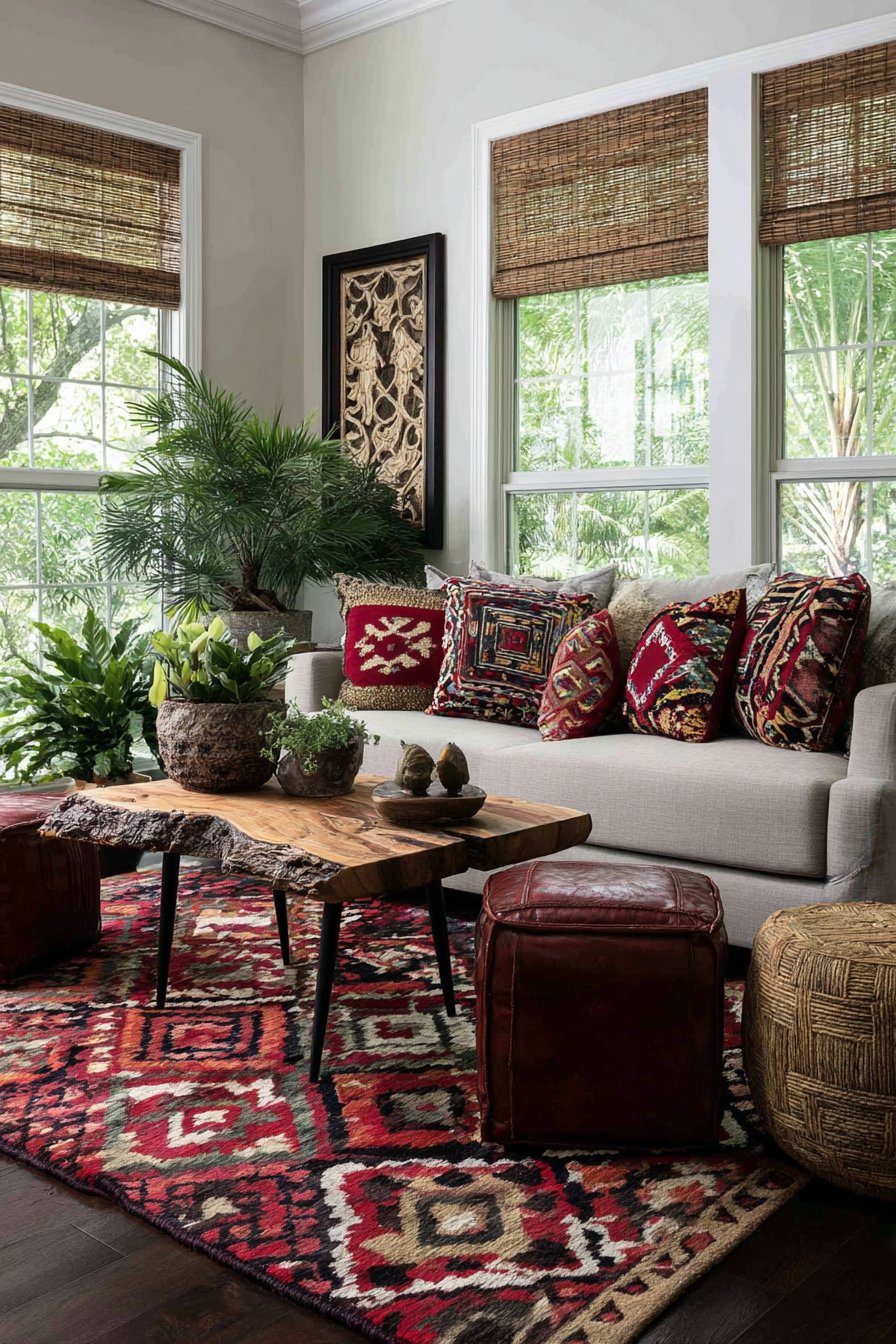 A large woven wall hanging from South America creates a focal point. African mudcloth throw pillows add geometric pattern and texture. Indian block-printed curtains filter natural light beautifully. A Turkish kilim rug grounds the seating area.