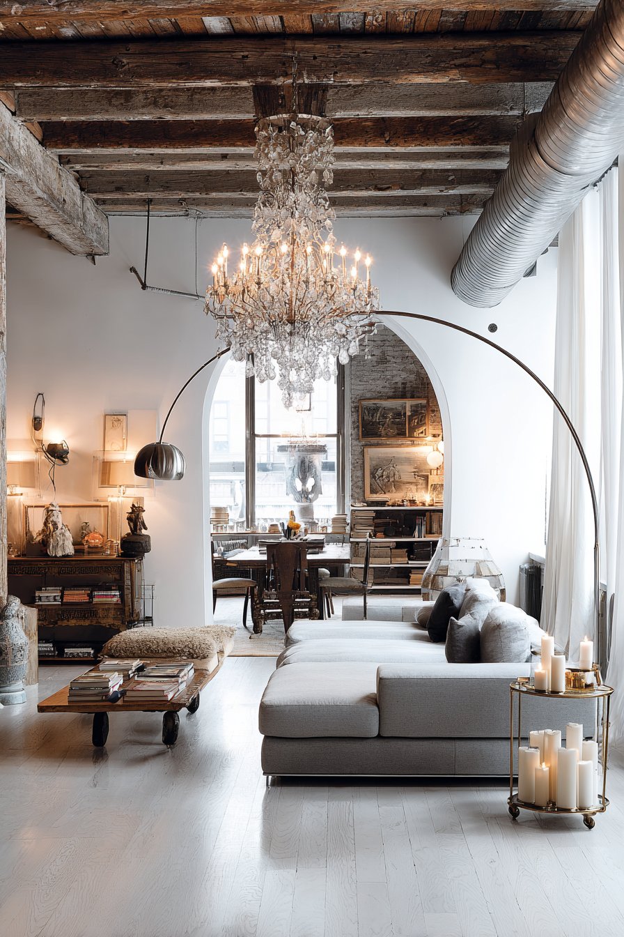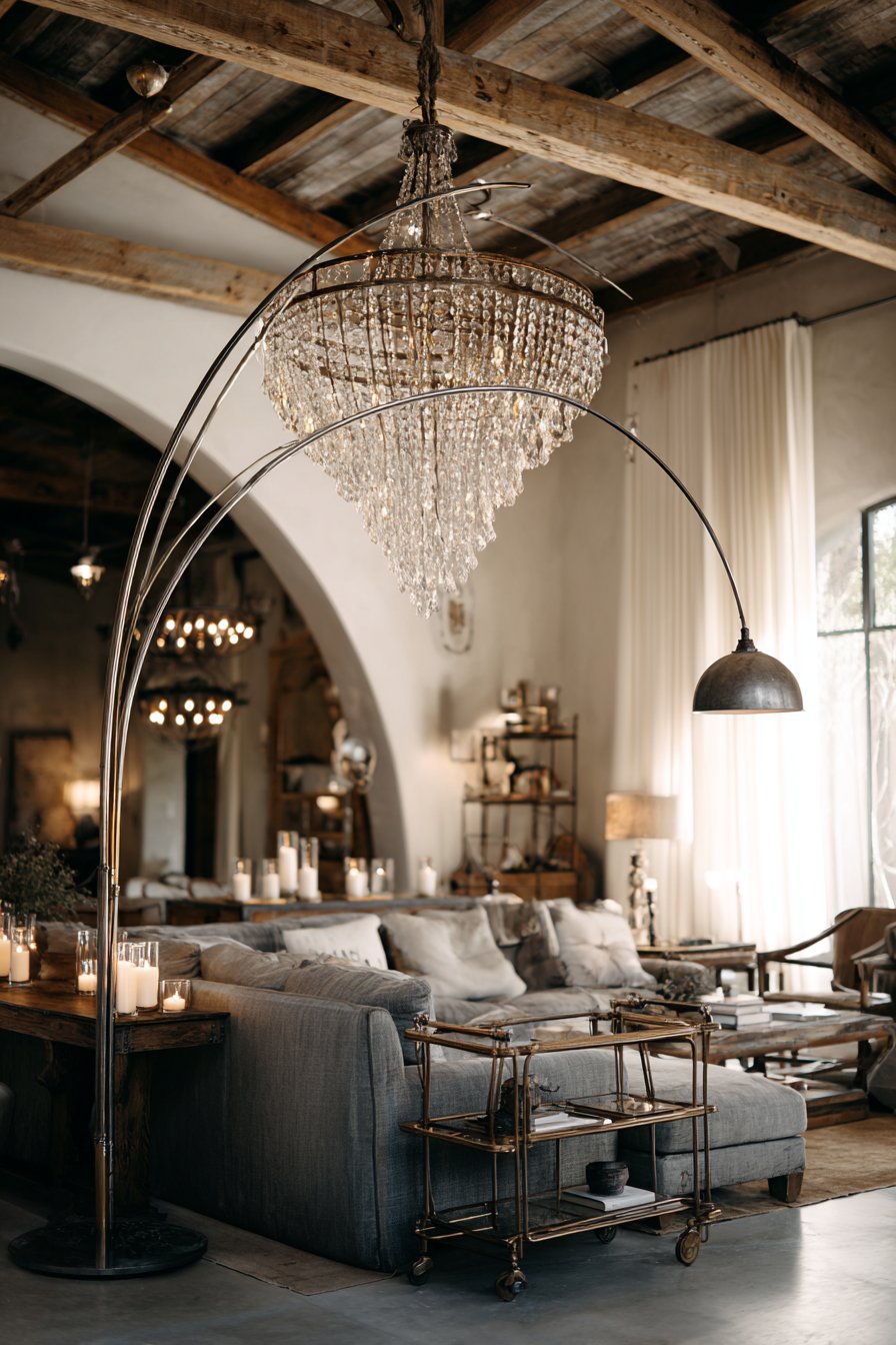 Multiple statement fixtures create dramatic visual interest overhead. A large vintage chandelier with crystal drops hangs from exposed wooden beams. A contemporary arc floor lamp with marble base reaches over a reading chair. Vintage wall sconces with Edison bulbs flank a gallery wall.