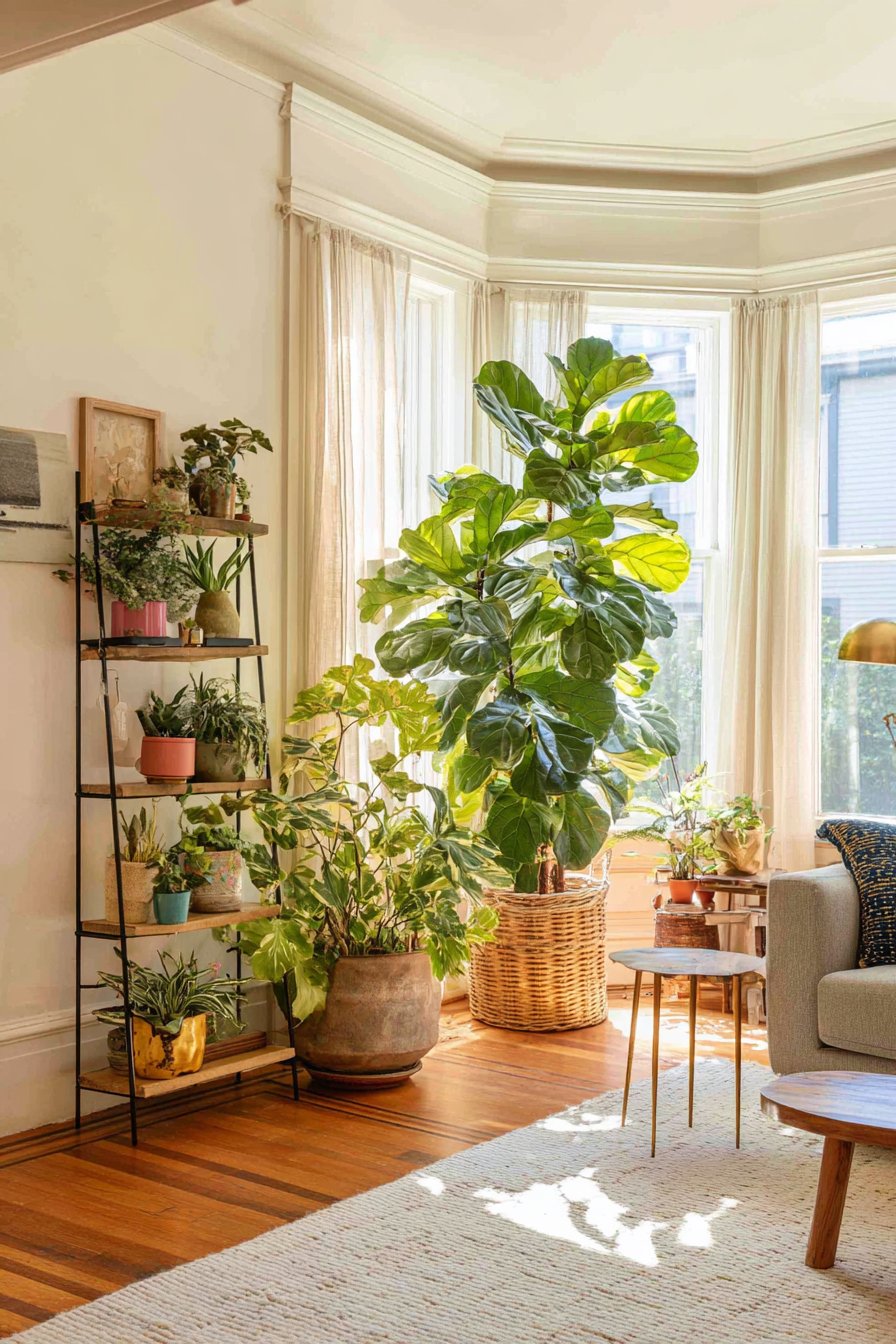 A large fiddle leaf fig in vintage ceramic anchors the plant display. Trailing pothos hang from macramé hangers at varying heights. A substantial monstera fills a woven basket with lush foliage. Snake plants in colorful glazed pots add vertical accents.