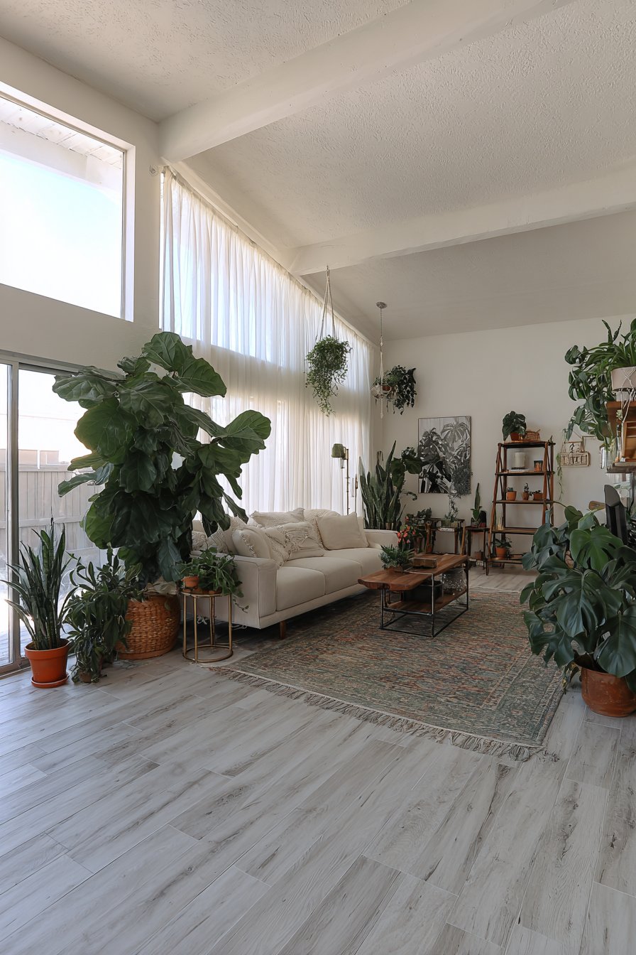 Floating shelves and floor placements create multi-level greenery. The room features a neutral base with white walls. Natural wood flooring allows the greenery to become the focal point. Large windows provide abundant natural light with sheer curtains creating soft filtration.