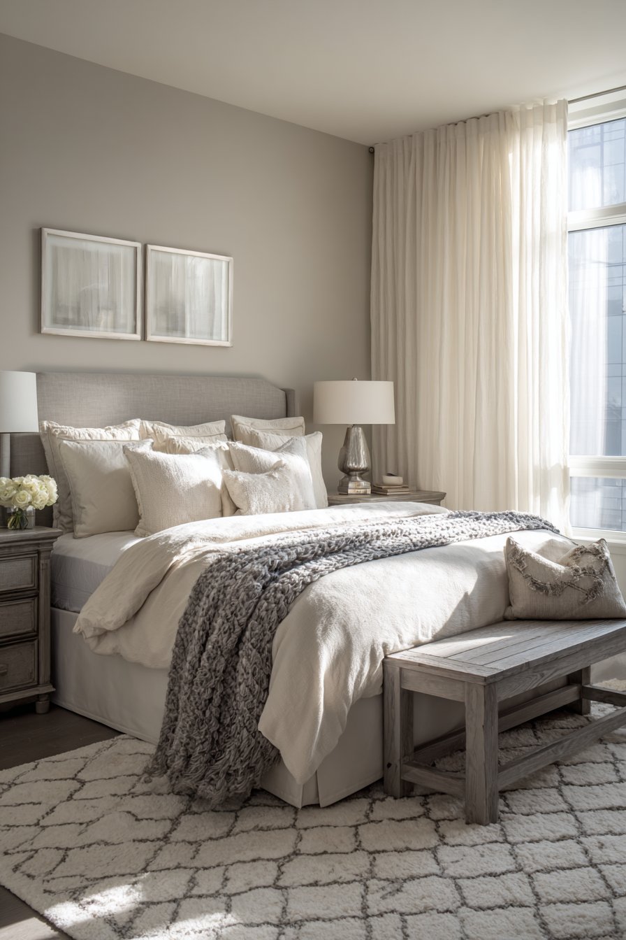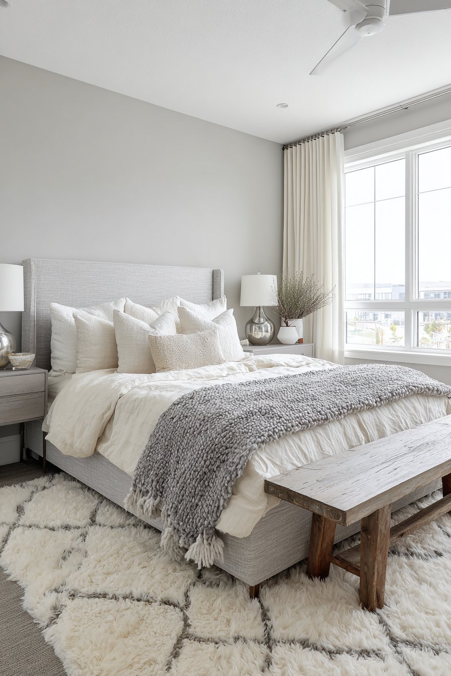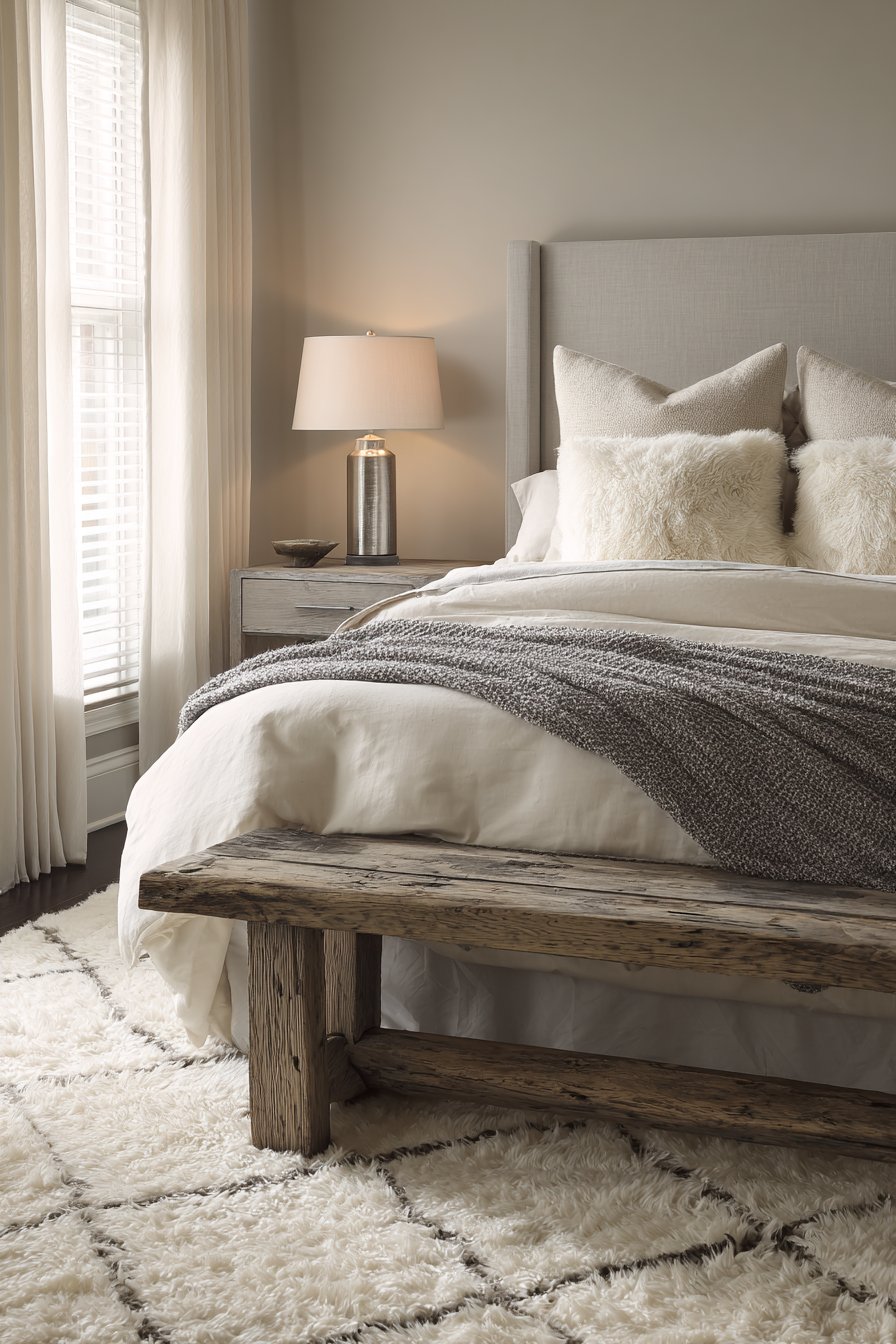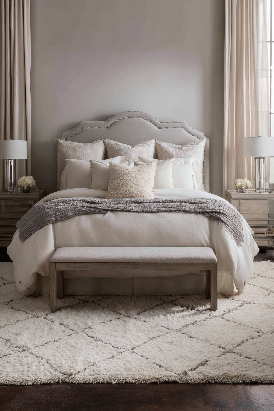 A plush cream wool area rug features delicate gray geometric patterns. This grounds the space beneath a reclaimed wood bench. Brushed nickel table lamps with cream linen shades provide balanced illumination. Gray-washed oak nightstands flank the bed symmetrically. The wood grain adds organic texture to the refined palette.