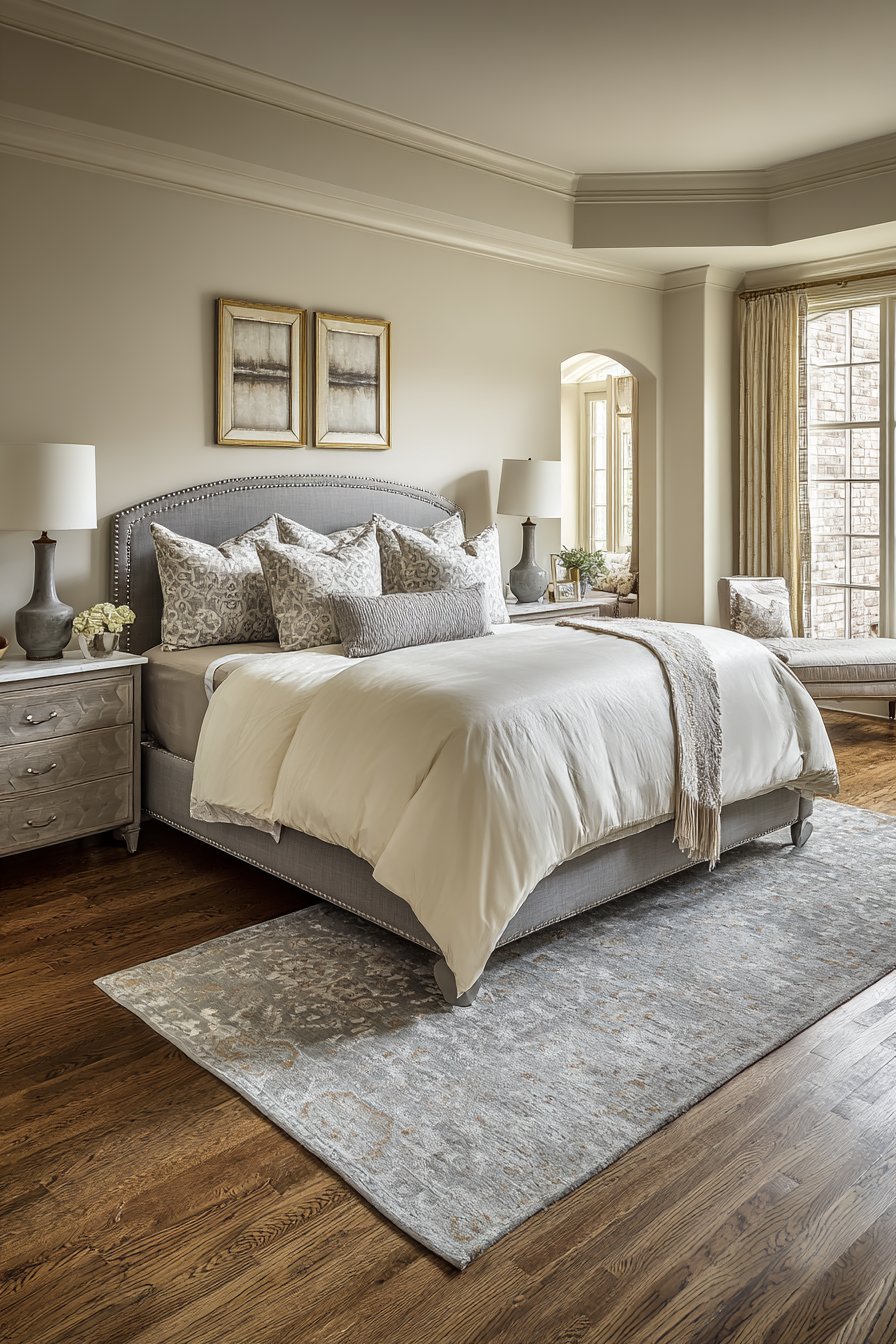 Layered cream linens feel luxurious and inviting. Gray velvet euro pillows add rich texture. A matching bed runner provides finishing touch. Remaining walls are painted warm cream with subtle pearl finish. A plush high-pile cream area rug provides softness underfoot. Gray border adds definition without heaviness.