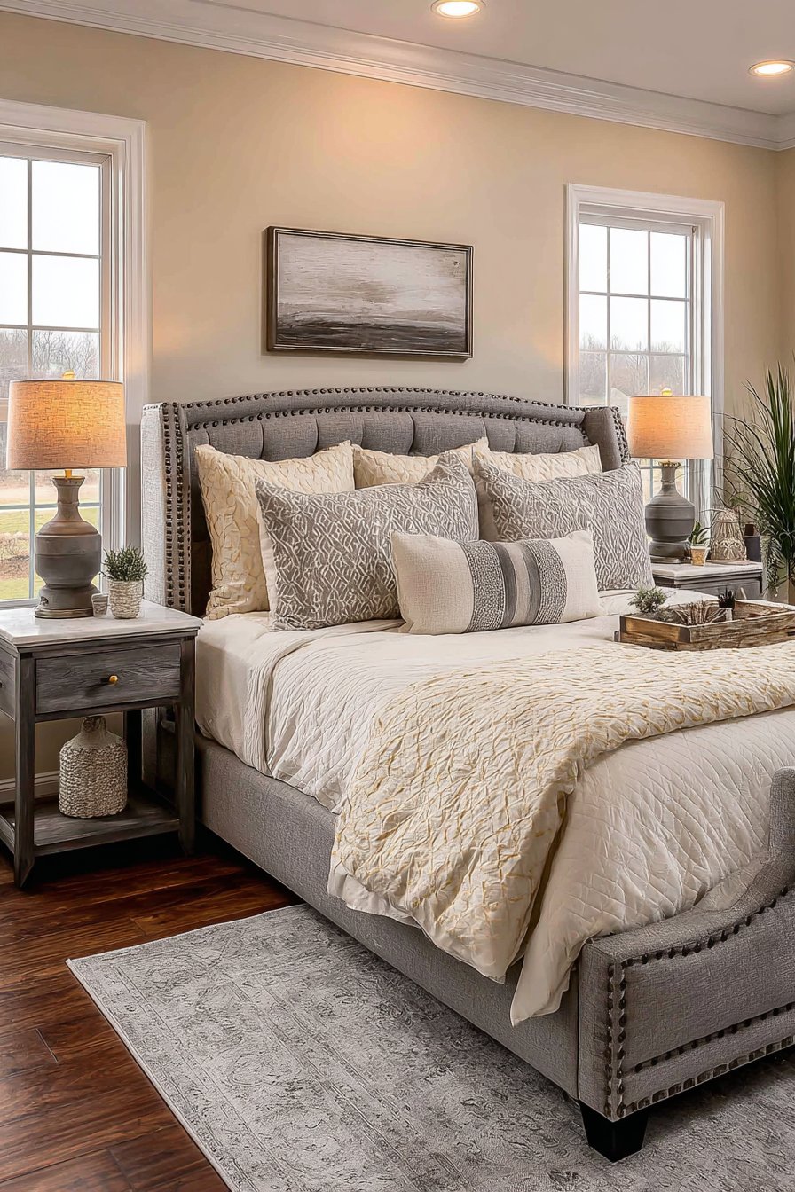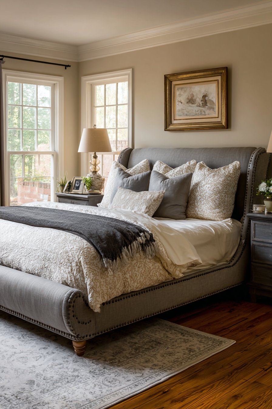 A substantial upholstered sleigh bed in soft gray features nailhead trim. This classic detail adds refined finishing. Cream hotel-style bedding creates luxurious comfort. Decorative pillows combine solid gray and cream with subtle patterns. Traditional gray-painted nightstands flank the bed symmetrically.